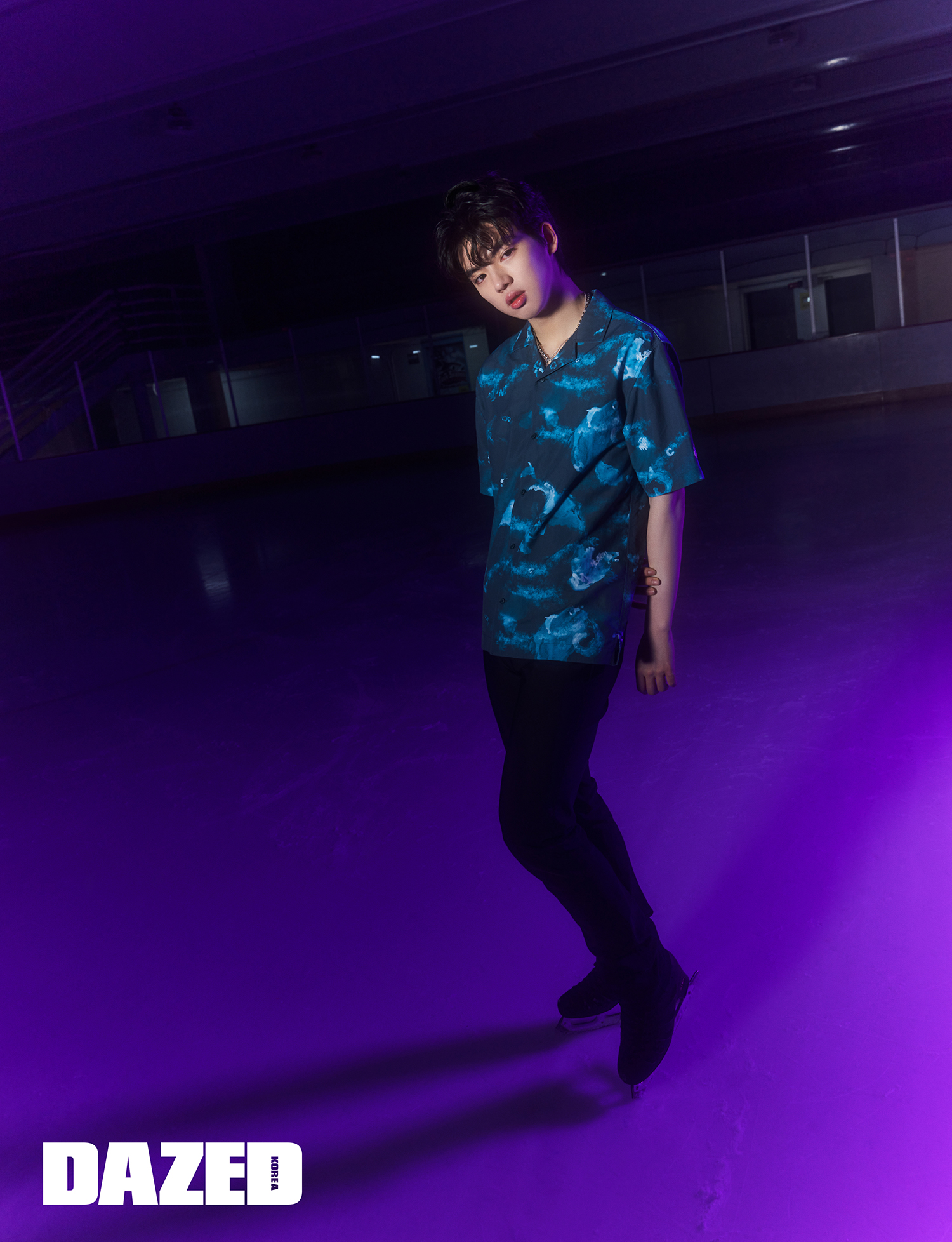 서머 프린트 셔츠는 코오롱스포츠(Kolon Sport), 실버 네크리스와 블랙 팬츠, 피겨 스케이트화는 모두 차준환의 것.