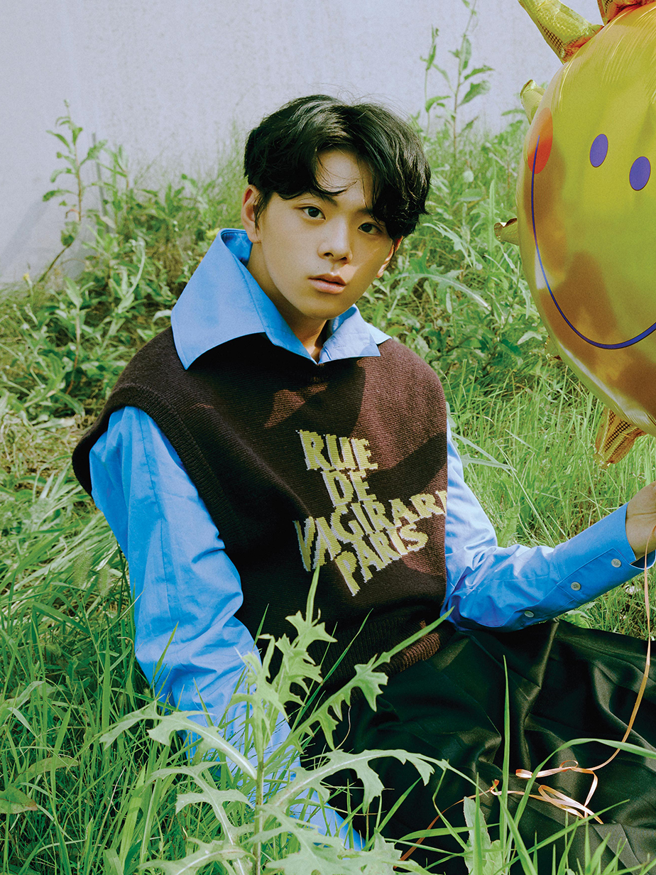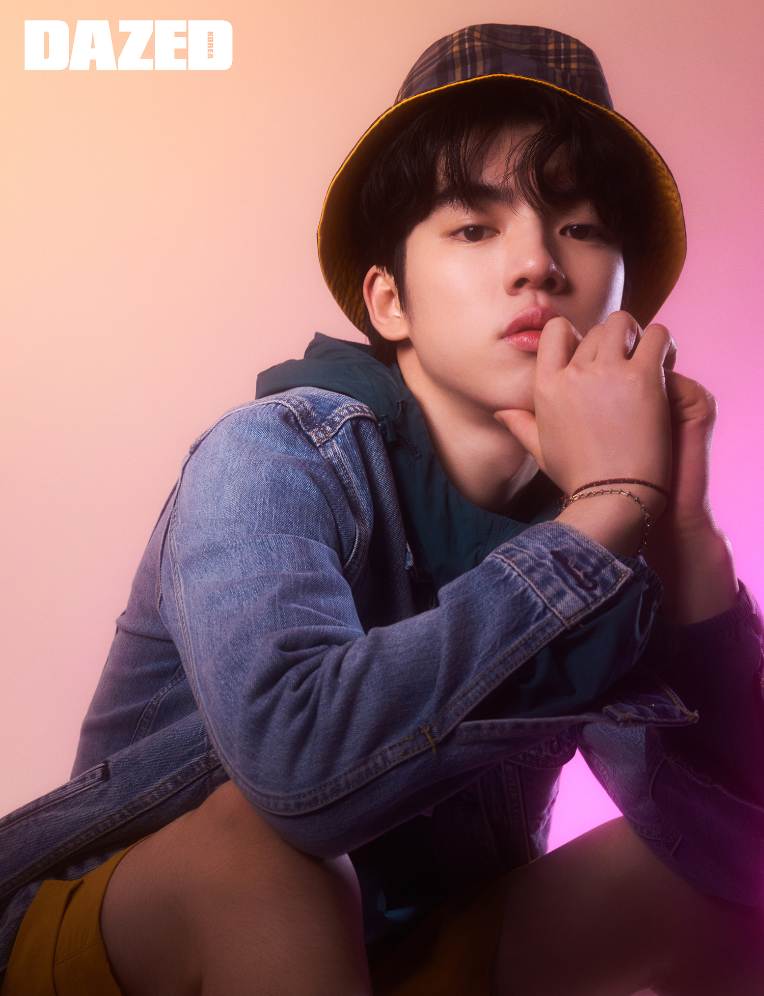체크 프린트 버킷 해트와 이너로 입은 그린 컬러 바람막이, 5부 카고 팬츠는 모두 코오롱스포츠(Kolon Sport), 데님 재킷은 에디터의 것, 실버 브레이슬릿과 매듭 브레이슬릿은 차준환의 것.