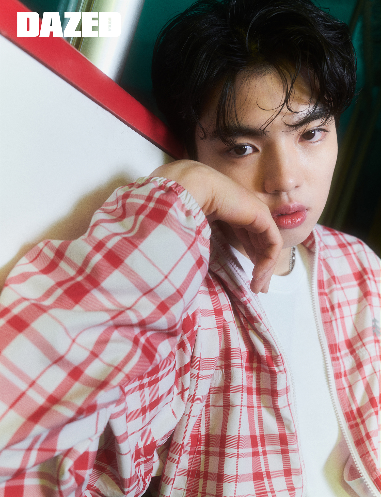 레드 컬러의 체크 프린트 바람막이와 로고 포인트 화이트 티셔츠는 코오롱스포츠(Kolon Sport), 실버 네크리스는 차준환의 것.