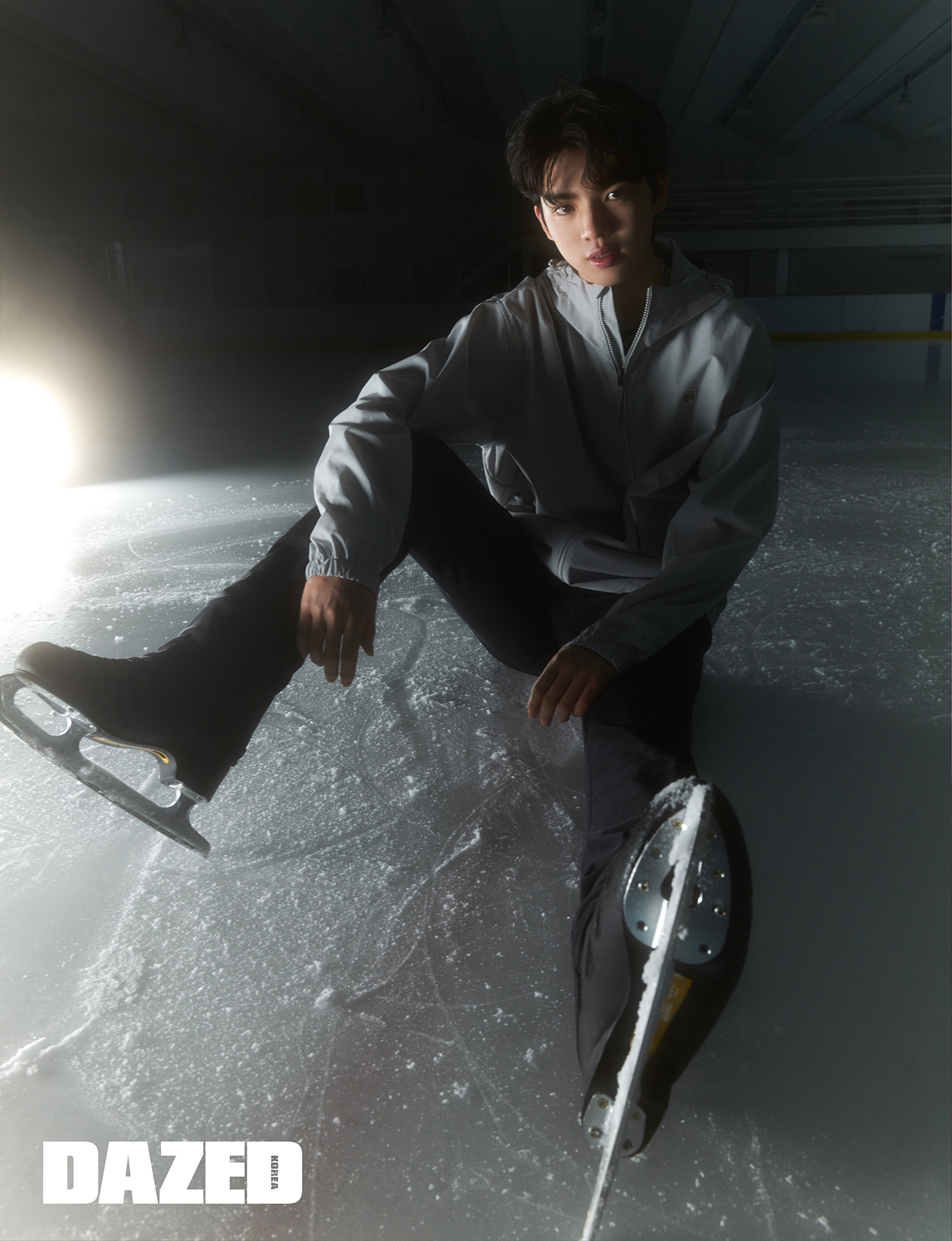 그레이 컬러 고어택스 재킷은 코오롱스포츠(Kolon Sport), 블랙 팬츠와 피겨 스케이트화는 차준환의 것.