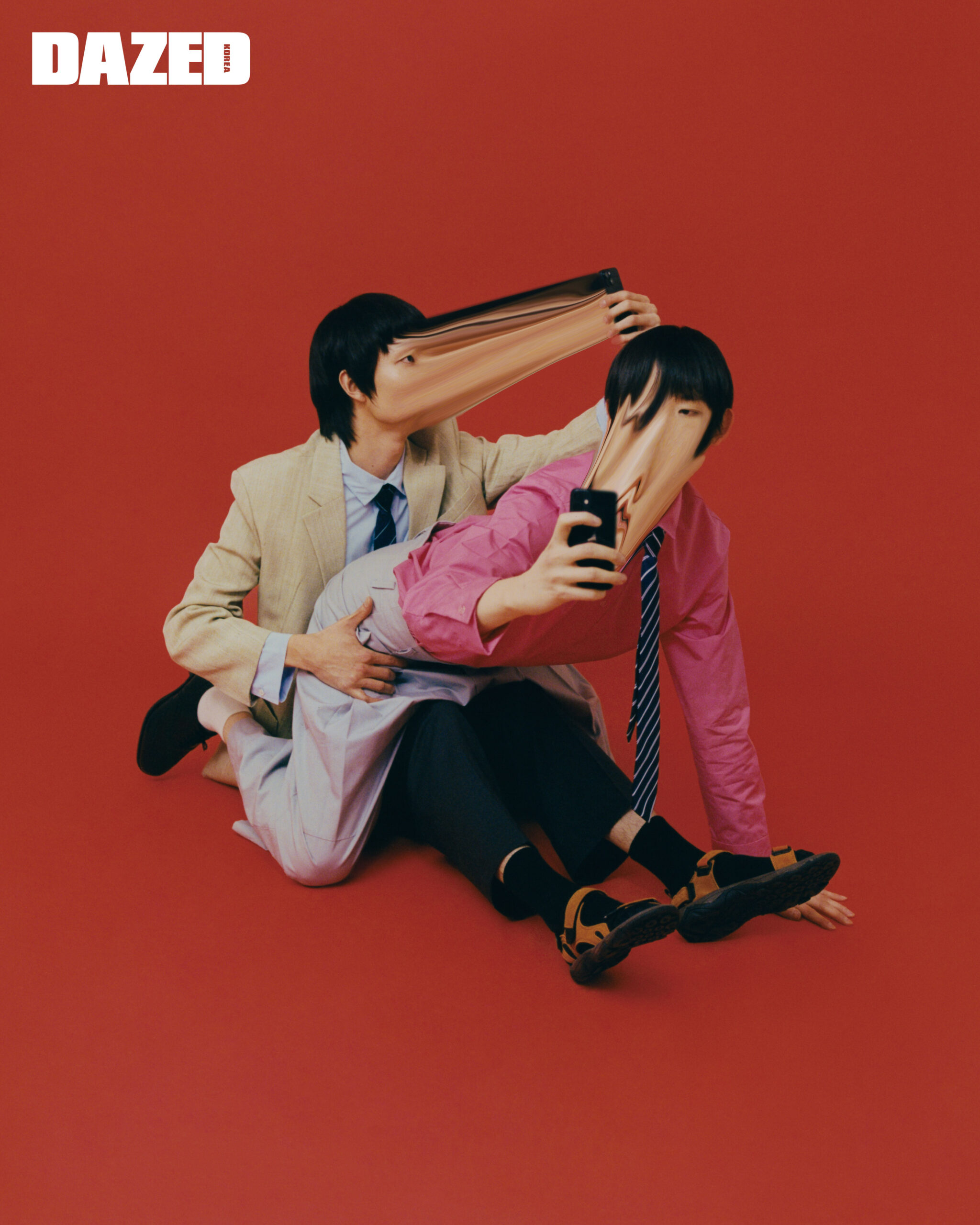 토비가 입은 재킷은 클럽모나코(Club Monaco), 블루 셔츠는 COS, 팬츠와 넥타이, 삭스, 샌들은 모두 에디터의 것. 지하가 입은 핑크 셔츠는 판가이아(Pangaia), 로퍼는 처치스(Churchs), 넥타이와 와이드 팬츠, 삭스는 모두 에디터의 것.