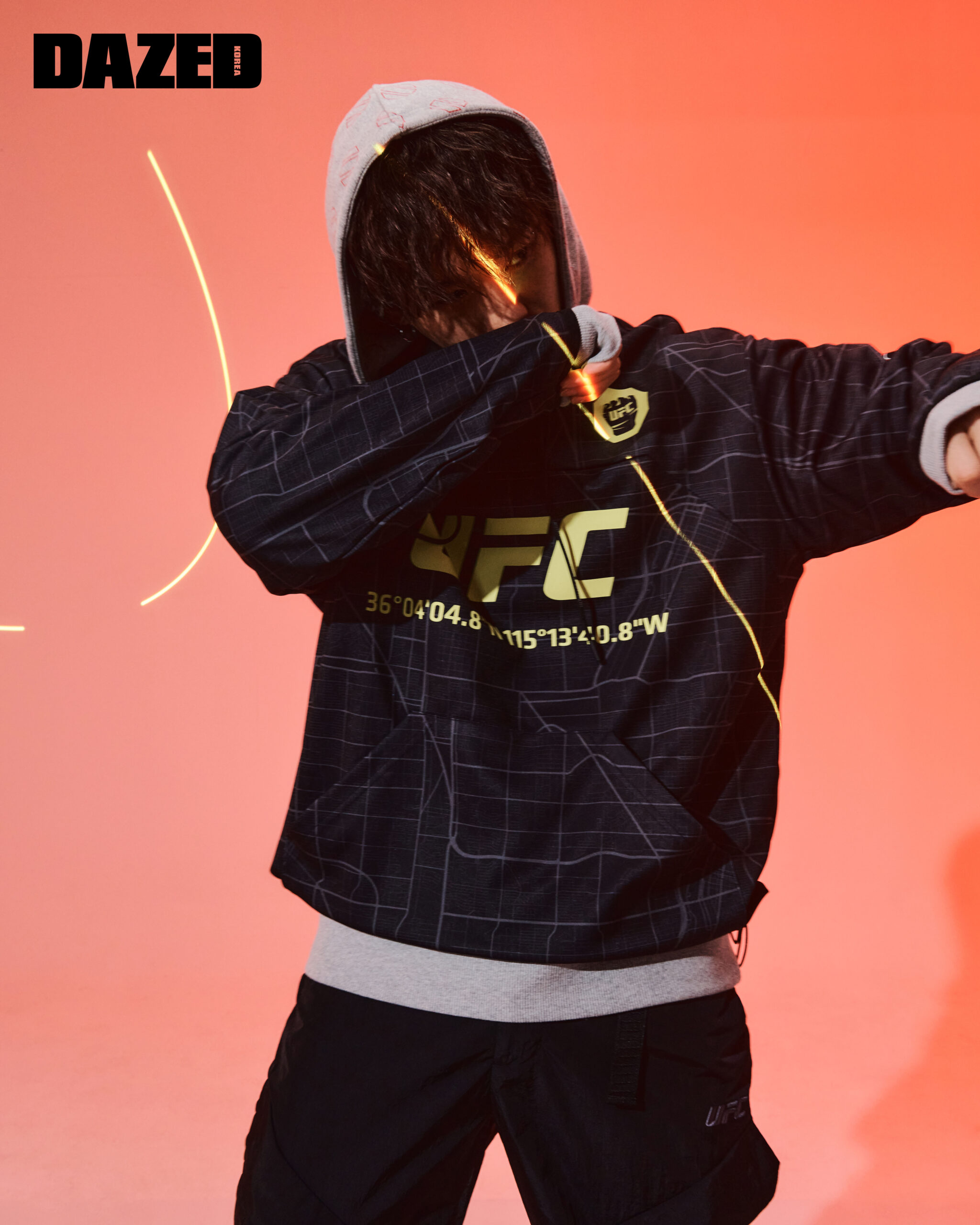 라스베이거스 레이서 톱(U2LST1113 BK)과 3스트로크 후디(U2SWT1313 MG), 글로스 카고 팬츠(U1LPT1111 BK)는 모두 유에프씨(UFC).