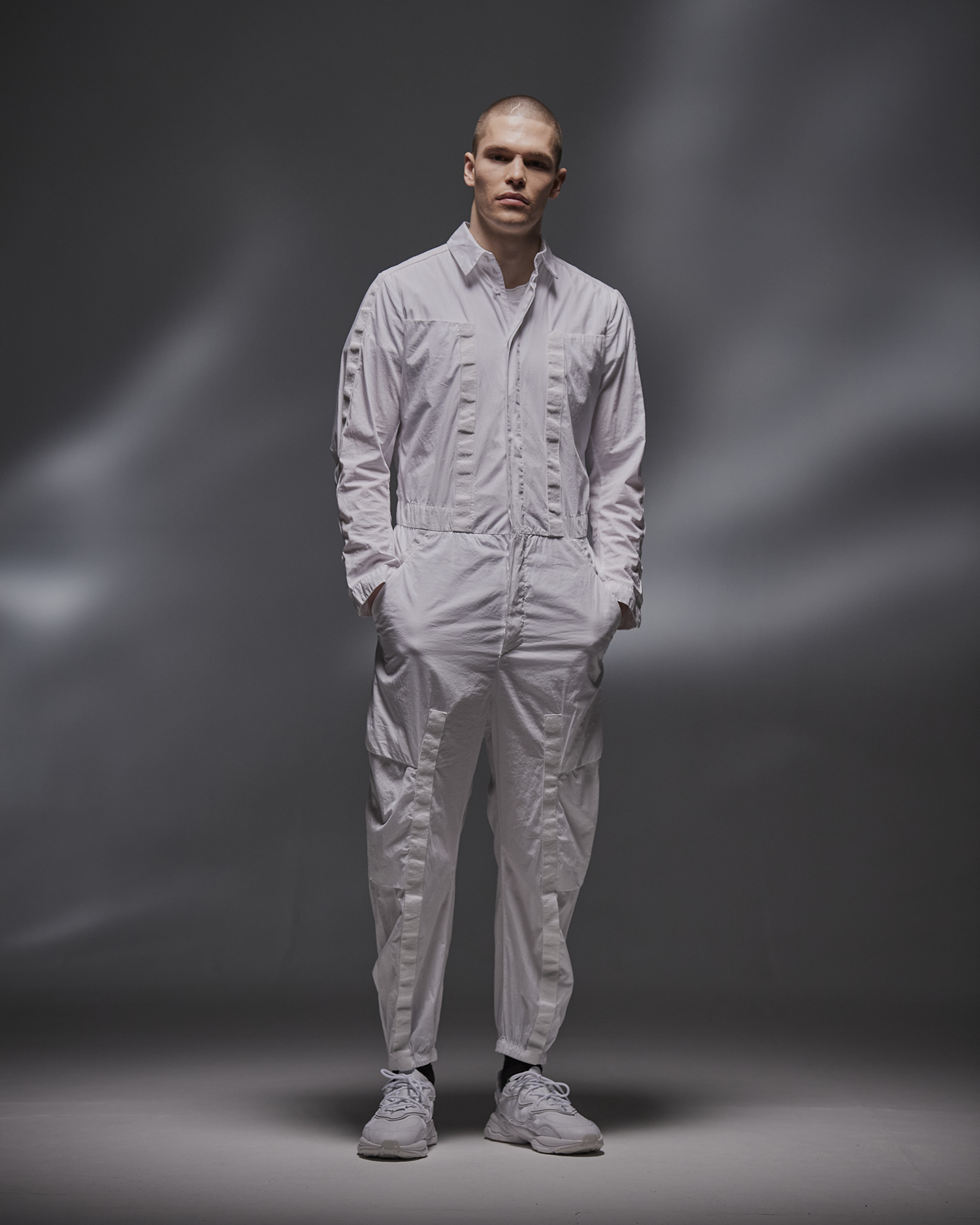 편안한 착용감이 특징인 코튼 소재의 루스 핏 점프슈트. 상단을 허리에 묶어 액티브한 무드의 팬츠로도 활용 가능하다.