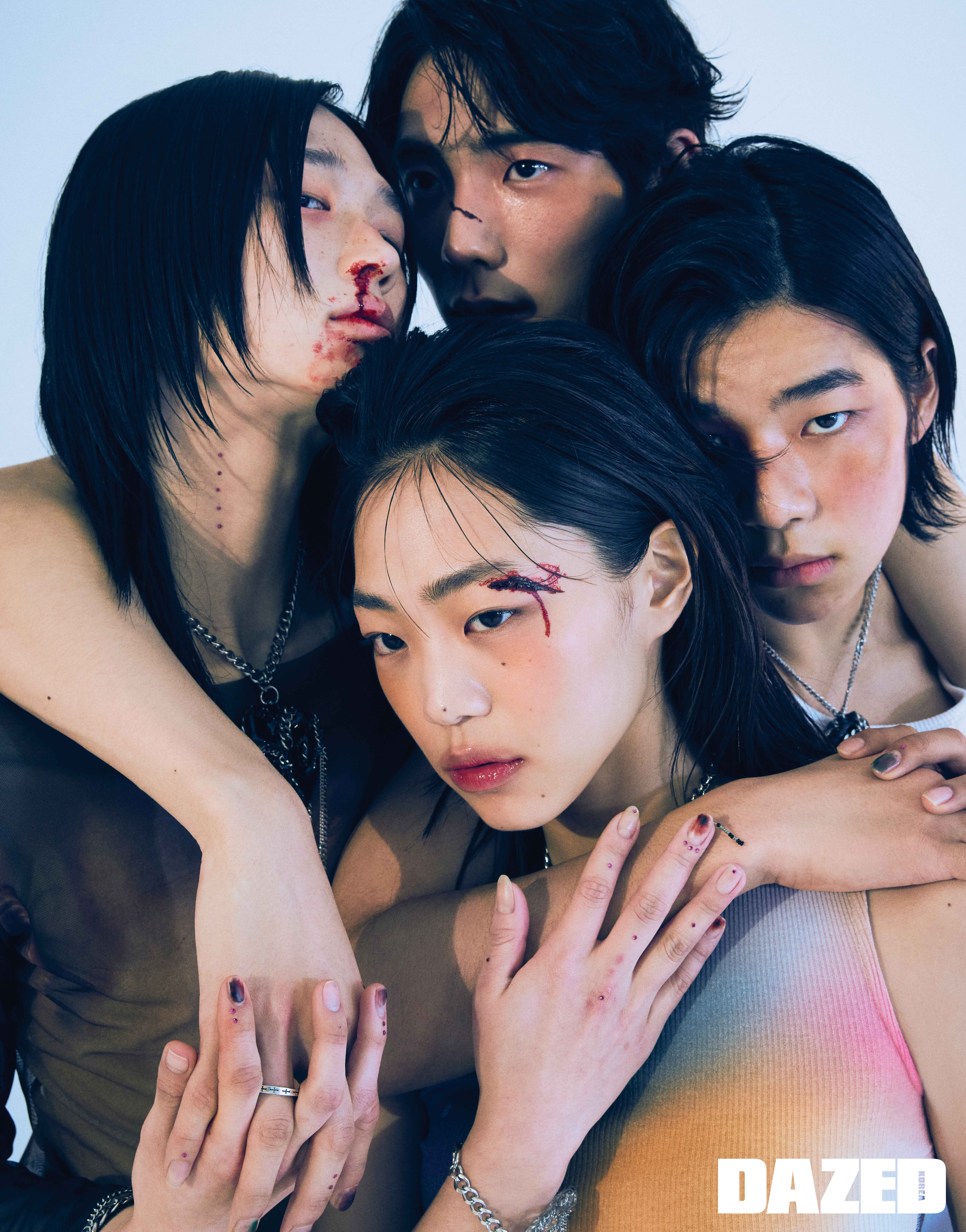 김온이 착용한 네크리스는 미세서울(Miséseoul), 디지털 프린트의 그래픽 메시 톱은 에디터의 것. 아준이 착용한 실버 링은 크롬하츠(Chrome Hearts). 채원이 입은 슬리브리스 톱은 51퍼센트(51Percent), 네크리스는 미세서울(Miséseoul). 윤지가 입은 니트 드레스는 로에베(Loewe), 네크리스와 브레이슬릿은 미세서울(Miséseoul).