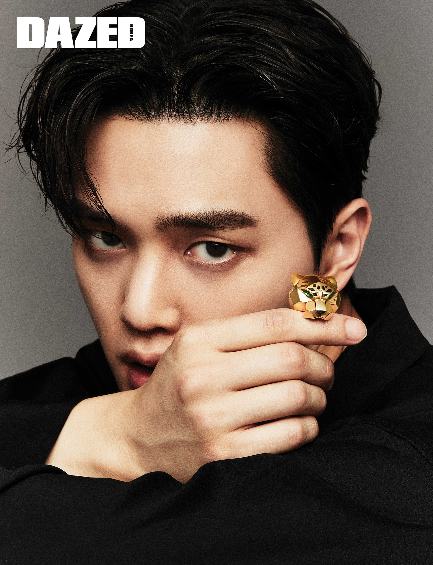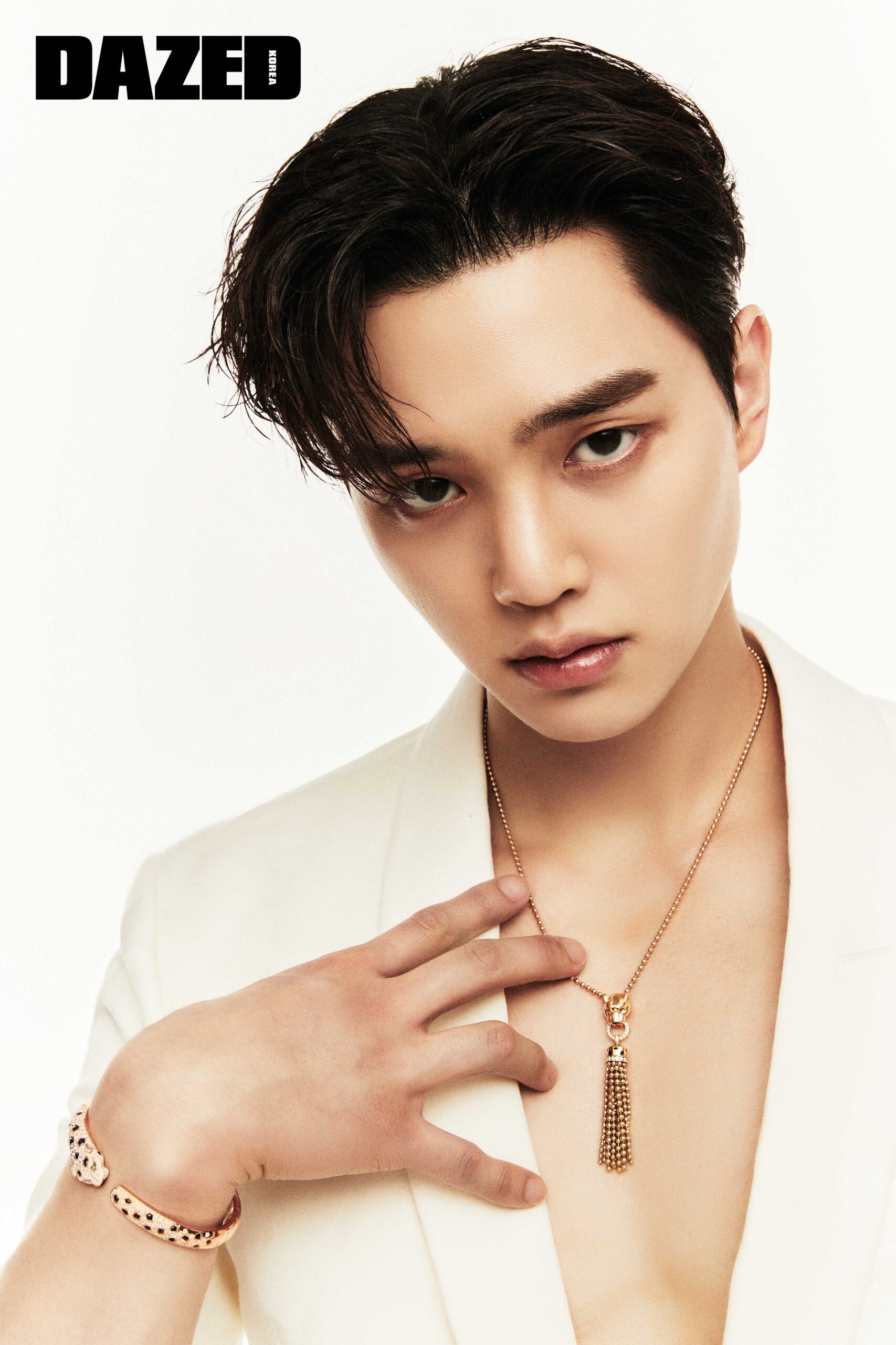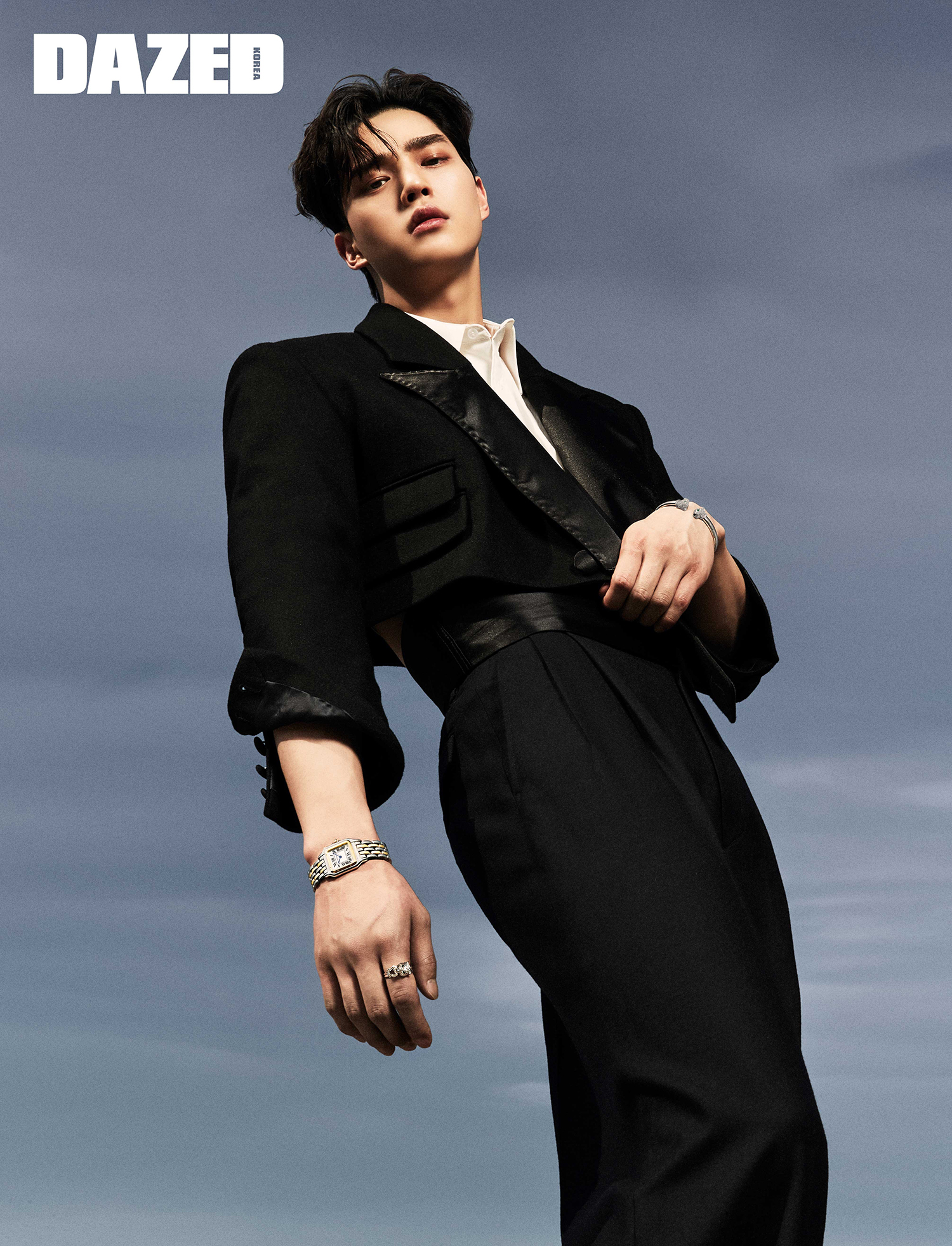 총 0.75캐럿의 브릴리언트 컷 다이아몬드 81개와 에메랄드, 오닉스를 세팅한 18K 화이트 골드 팬더 드 까르띠에 링, 18K 옐로 골드 및 스틸 케이스와 18K 옐로 골드 및 스틸 브레이슬릿의 미디엄 모델 쿼츠 무브먼트 팬더 드 까르띠에 워치, 총 1.37캐럿의 브릴리언트 컷 다이아몬드 194개와 에메랄드, 오닉스를 세팅한 18K 화이트 골드 팬더 드 까르띠에 브레이슬릿은 모두 까르띠에(Cartier). 울 크롭트 재킷은 디카페인 옴므(Decaffeine Homme), 크롭트 셔츠는 본봄(Bonbom), 울 팬츠는 오디너리피플(Oridinary People), 커머번드는 스타일리스트의 것.