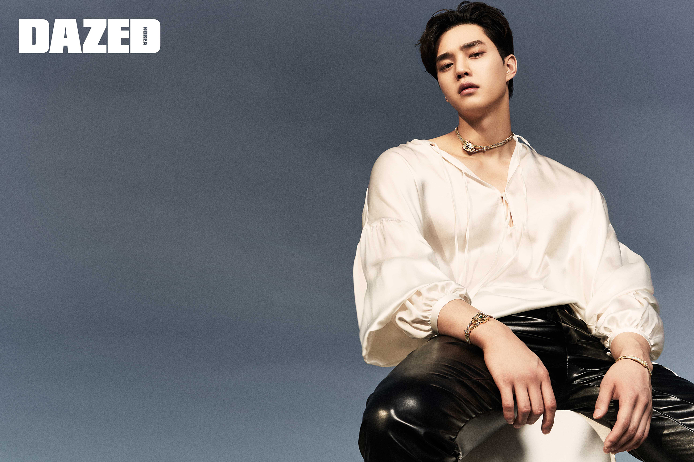 총 0.16캐럿의 브릴리언트 컷 다이아몬드 3개와 차보라이트 가닛, 오닉스, 블랙 래커를 세팅한 18K 옐로 골드 팬더 드 까르띠에 네크리스, 오른손에 착용한 총 0.16캐럿의 브릴리언트 컷 다이아몬드 3개와 차보라이트 가닛, 오닉스, 블랙 래커를 세팅한 18K 옐로 골드 팬더 드 까르띠에 브레이슬릿, 왼손에 착용한 브릴리언트 컷 다이아몬드와 오닉스, 에메랄드를 세팅한 18K 옐로 골드 팬더 드 까르띠에 브레이슬릿은 모두 까르띠에(Cartier). 실크 셔츠는 르메테크(Lemeteque), 레더 팬츠는 스타일리스트의 것.