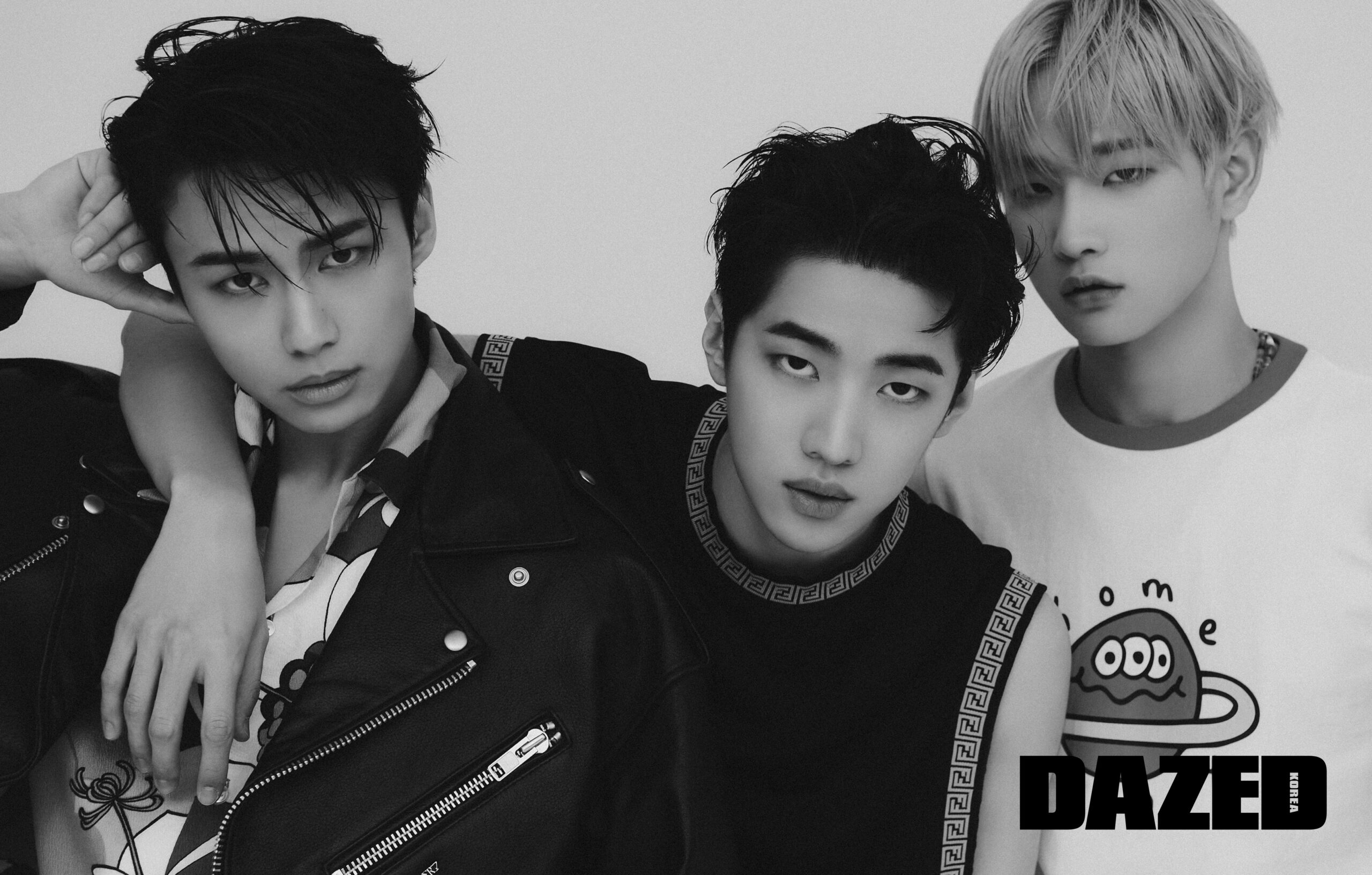 경윤이 입은 라이더 재킷은 홀리넘버세븐(Holy Number 7), 프린트 셔츠는 에디터의 것. 재찬이 입은 슬리브리스 톱은 펜디(Fendi). 기석이 입은 프린트 티셔츠는 더뮤지엄비지터(The Museum Visitor), 비즈 네크리스는 에디터의 것.