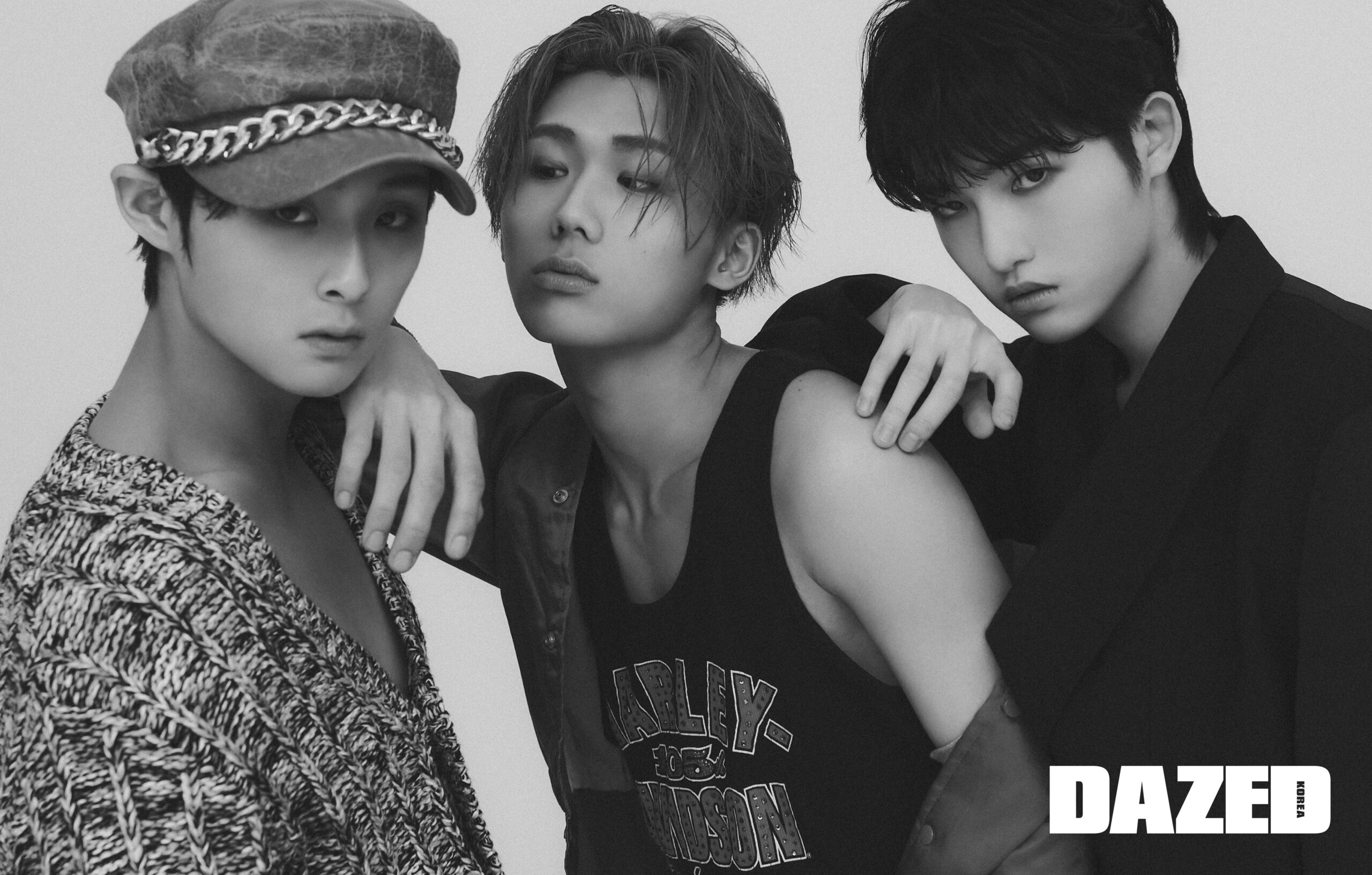 민규가 입은 카디건은 살바토레 페라가모(Salvatore Ferragamo), 체인 디테일 뉴스보이 캡은 홀리넘버세븐(Holy Number 7). 종형이 입은 레드 바시티 재킷과 슬리브리스 톱은 에디터의 것. 세현이 입은 오버사이즈 재킷은 알렉산더 맥퀸(Alexander McQueen).
