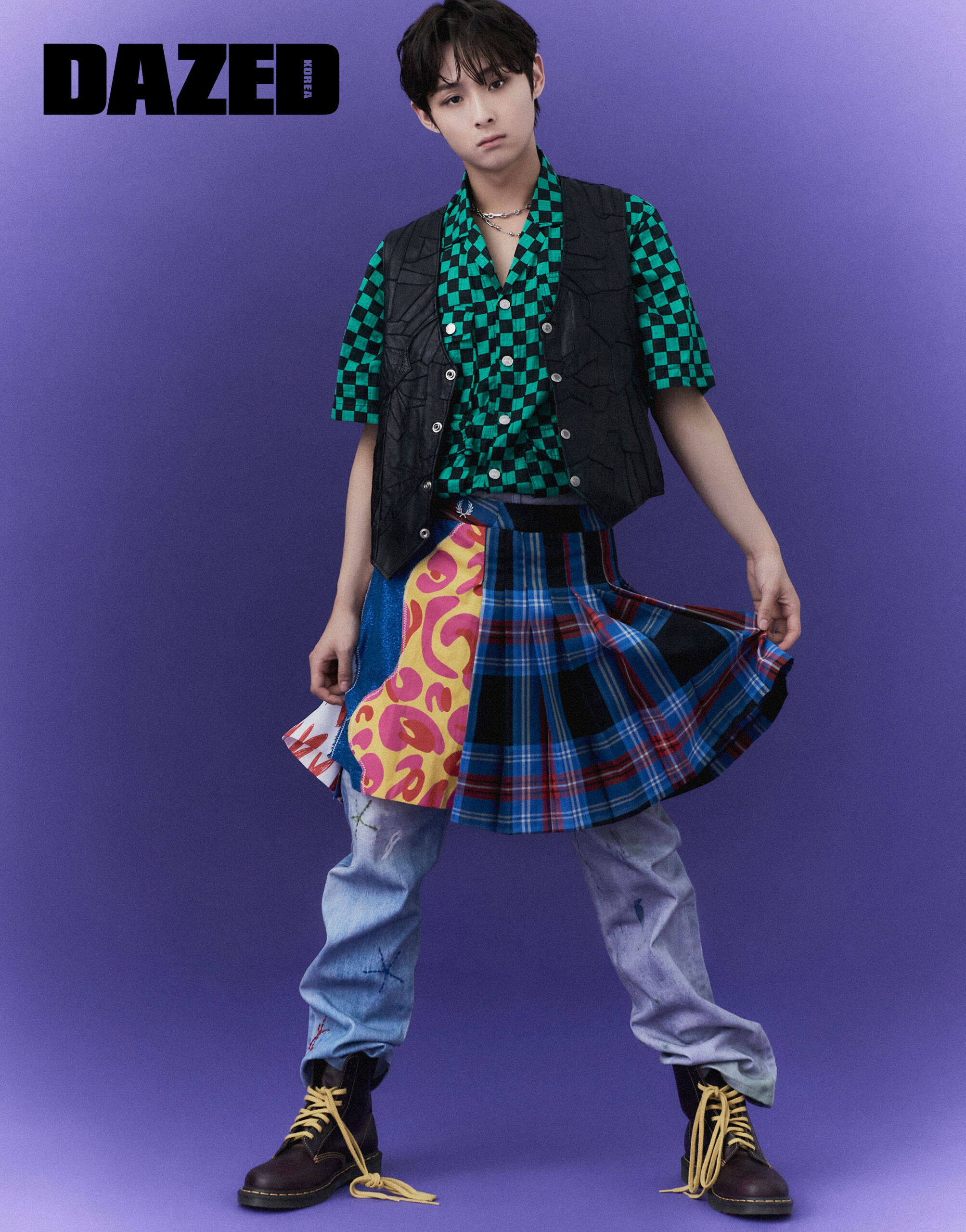 체크 패턴 셔츠는 디스퀘어드2(Dsquared2), 타탄체크 스커트는 프레드 페리(Fred Perry), 데님 팬츠는 더뮤지엄비지터(The Museum Visitor), 워커는 닥터마틴(Dr. Martens), 체인 네크리스는 돌체앤가바나(Dolce&Gabbana), 레더 베스트는 에디터의 것.