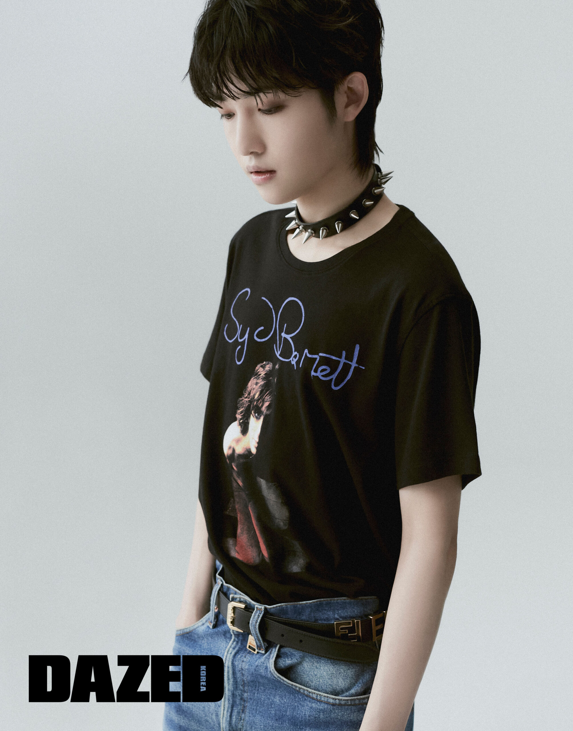 프린트 티셔츠는 존 바바토스(John Varvatos), 로고 벨트는 펜디(Fendi), 데님 팬츠와 초커는 에디터의 것.