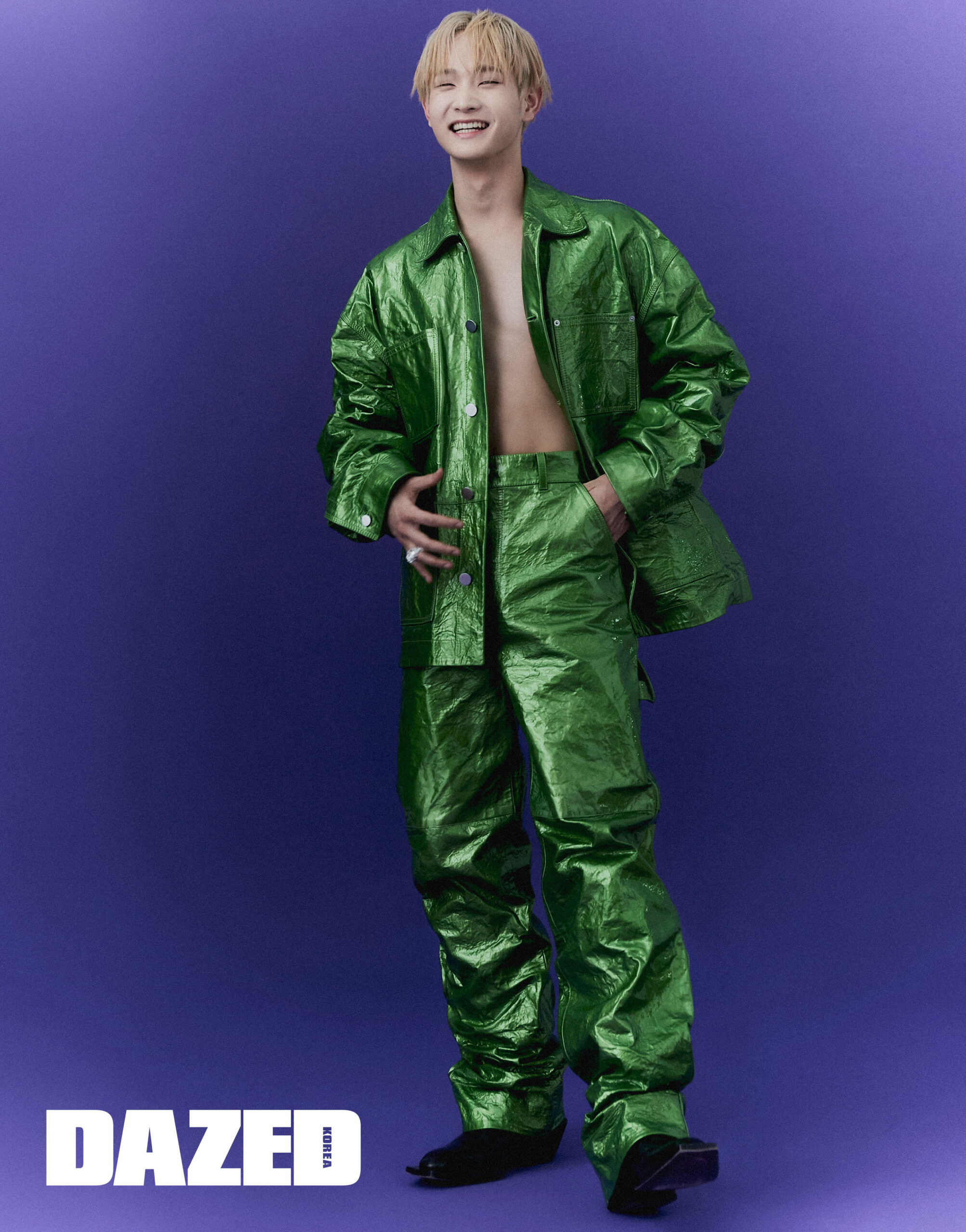에나멜 소재의 재킷과 팬츠, 링은 모두 보테가 베네타(Bottega Veneta), 스퀘어 토 앵클부츠는 돌체앤가바나(Dolce&Gabbana).