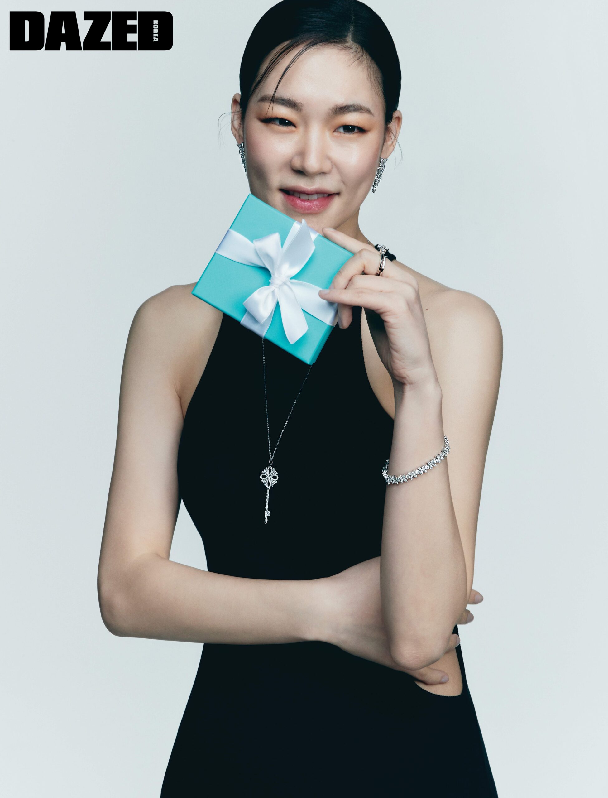 플래티넘 소재의 라운드 브릴리언트 컷 & 마퀴즈 컷 & 페어 셰이프 다이아몬드를 세팅한 티파니 빅토리아 키 펜던트와 총 1.67캐럿 마퀴즈 컷 다이아몬드, 총 1.48캐럿 페어 셰이프 다이아몬드, 총 1.10캐럿 라운드 브릴리언트 컷 다이아몬드를 세팅한 플래티넘 소재의 티파니 빅토리아 믹스드 클러스터 드롭 이어링, 총 3.79캐럿의 마퀴즈 컷 다이아몬드와 총 2.22캐럿 라운드 브릴리언트 컷 다이아몬드를 세팅한 플래티넘 소재의 티파니 빅토리아 얼터네이팅 브레이슬릿, 플래티넘 소재의 라운드 브릴리언트 컷 다이아몬드를 세팅한 티파니 솔리스트 브이 밴드 링과 플래티넘 소재의 2.40캐럿 티파니 세팅 링은 모두 티파니(Tiffany & Co.), 라운드 슬릿 디테일의 블랙 드레스는 오프화이트(Off-White™).