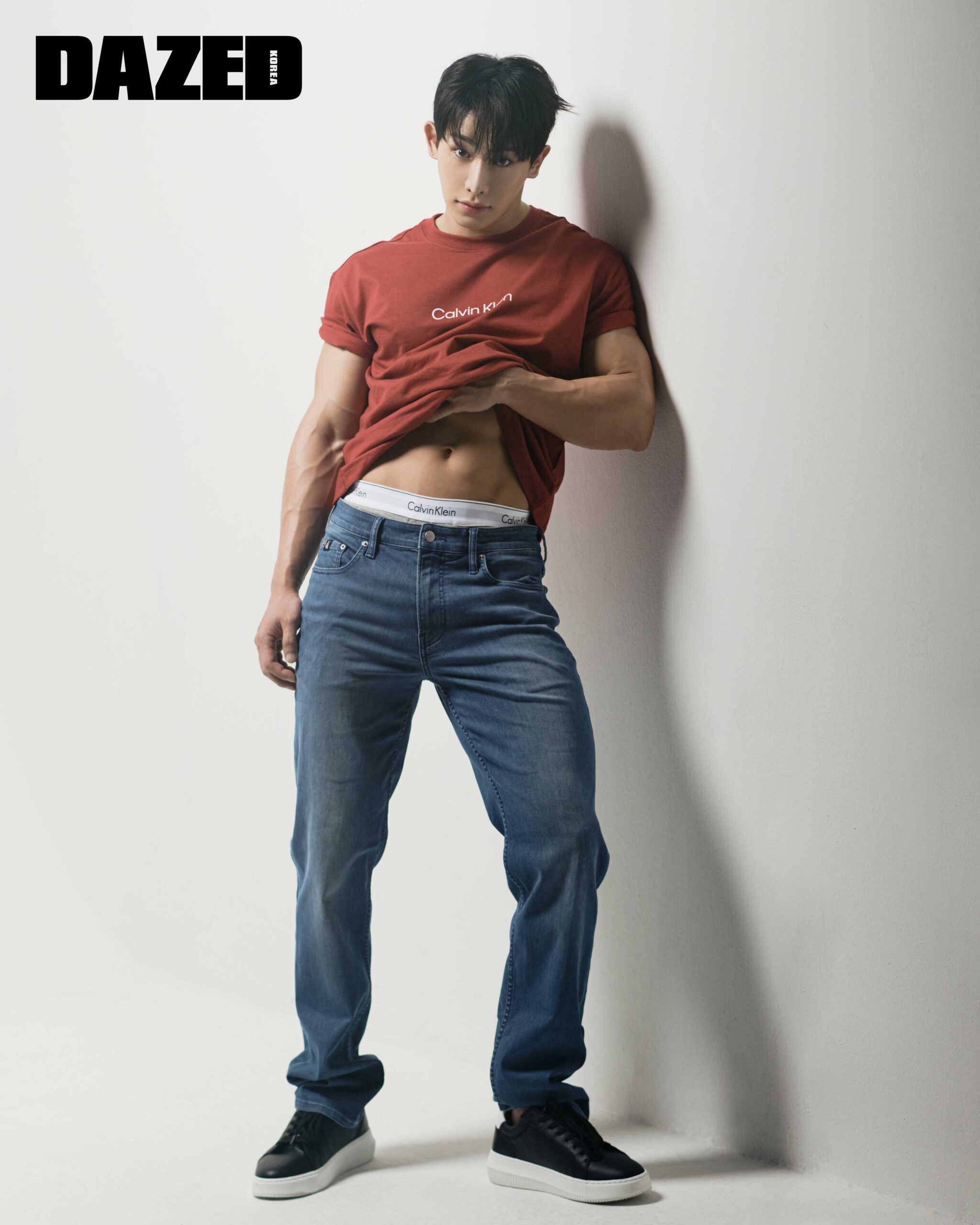 레드 컬러의 로고 티셔츠와 스트레이트 핏의 데님 팬츠는 캘빈클라인 (Calvin Klein Jeans), 그레이 컬러의 트렁크는 캘빈클라인 언더웨어(Calvin Klein Underwear), 블랙 컬러의 레더 스니커즈는 캘빈클라인 풋웨어(Calvin Klein Footwear).