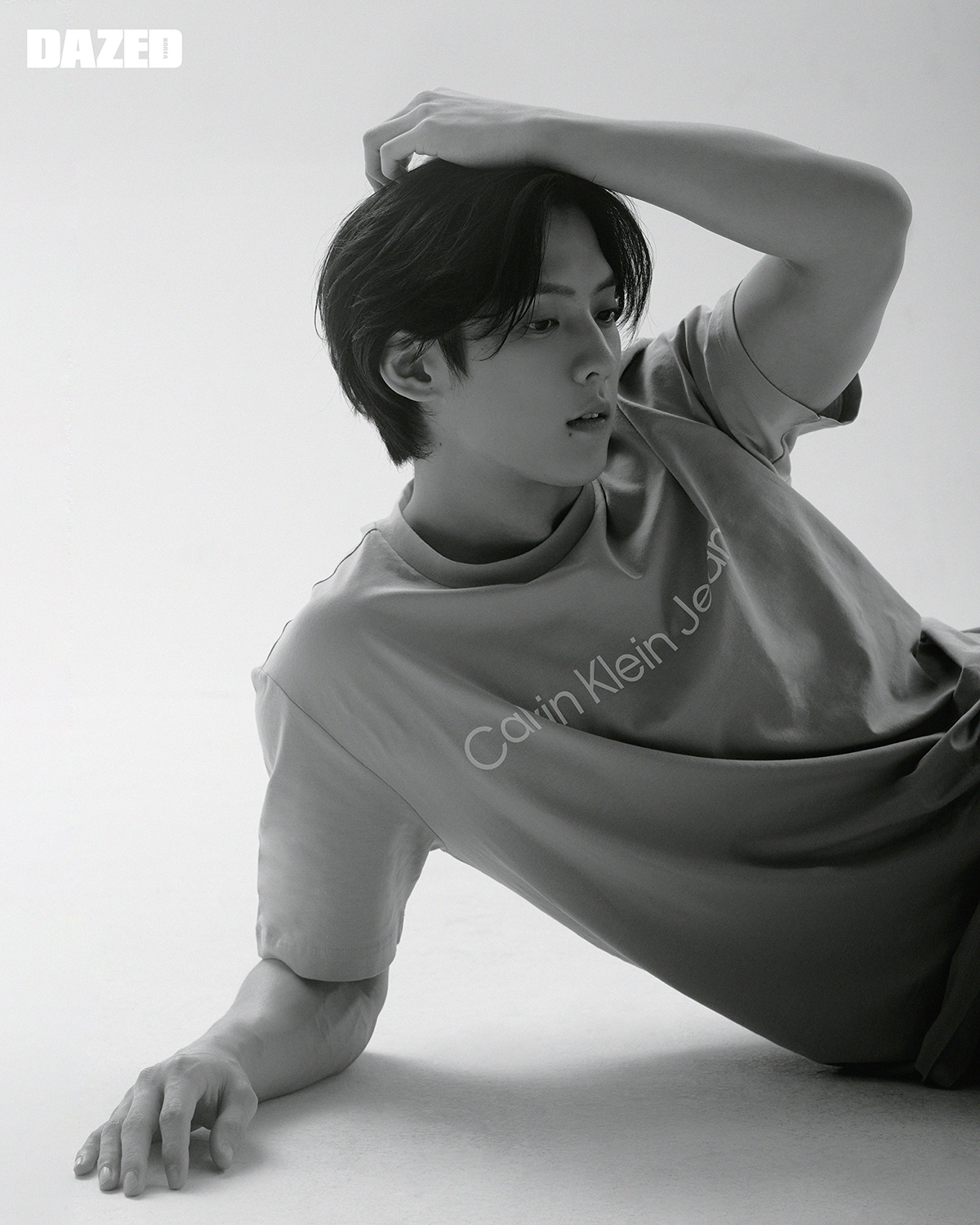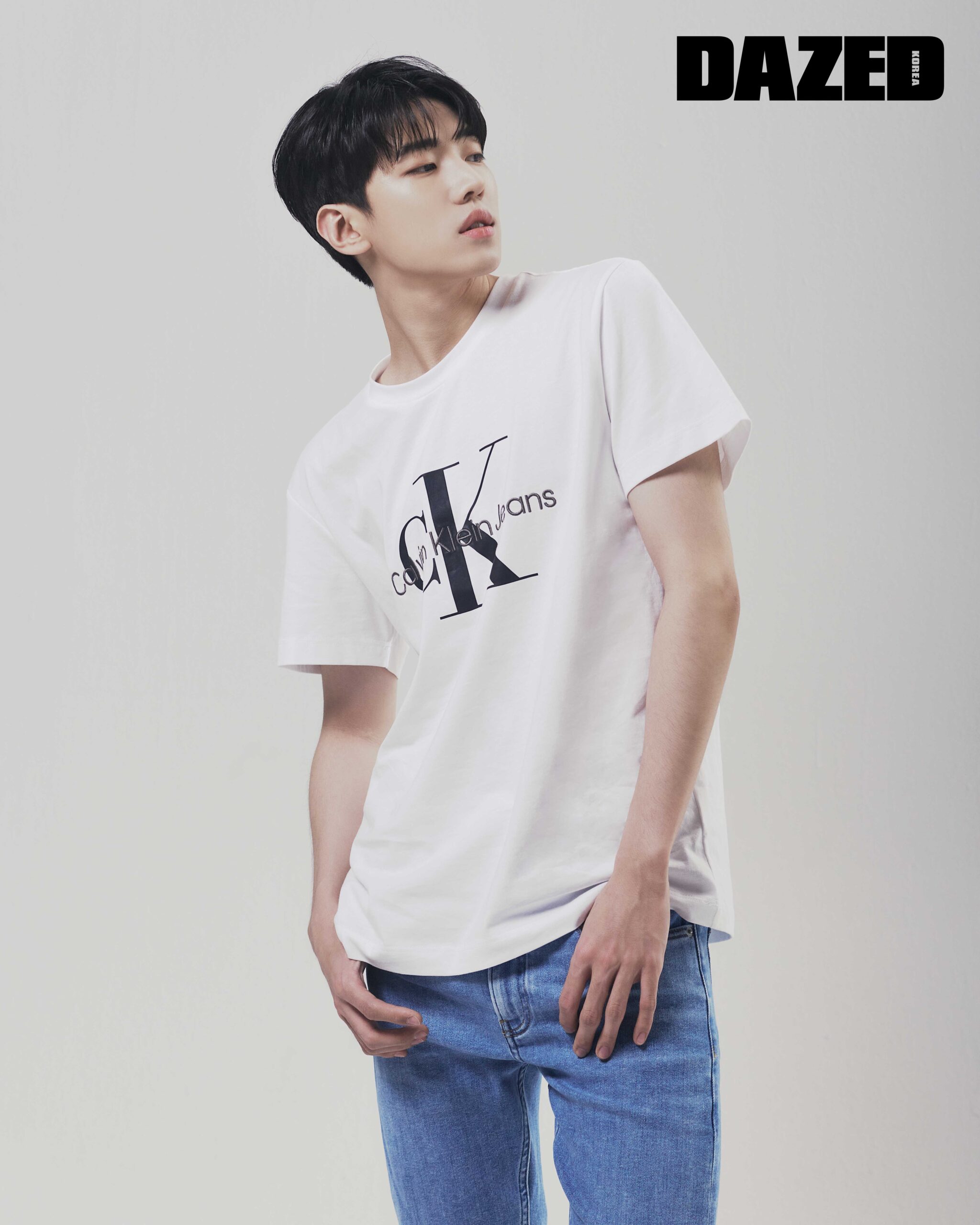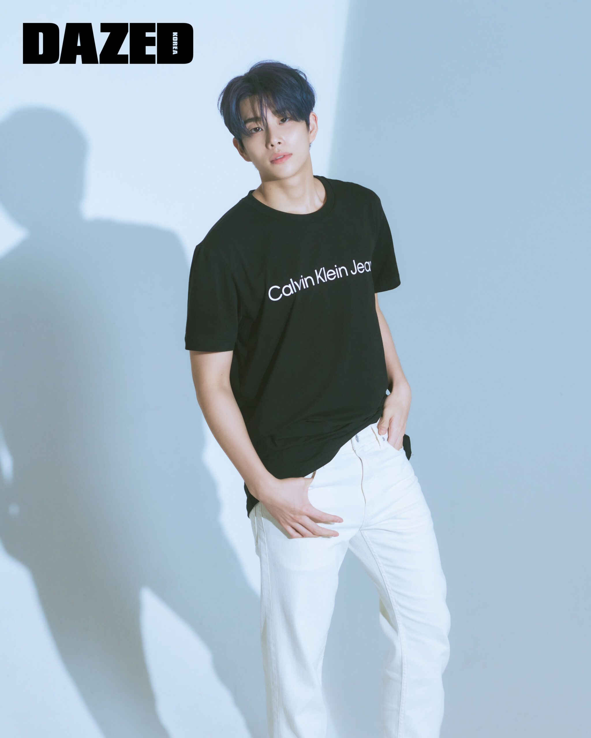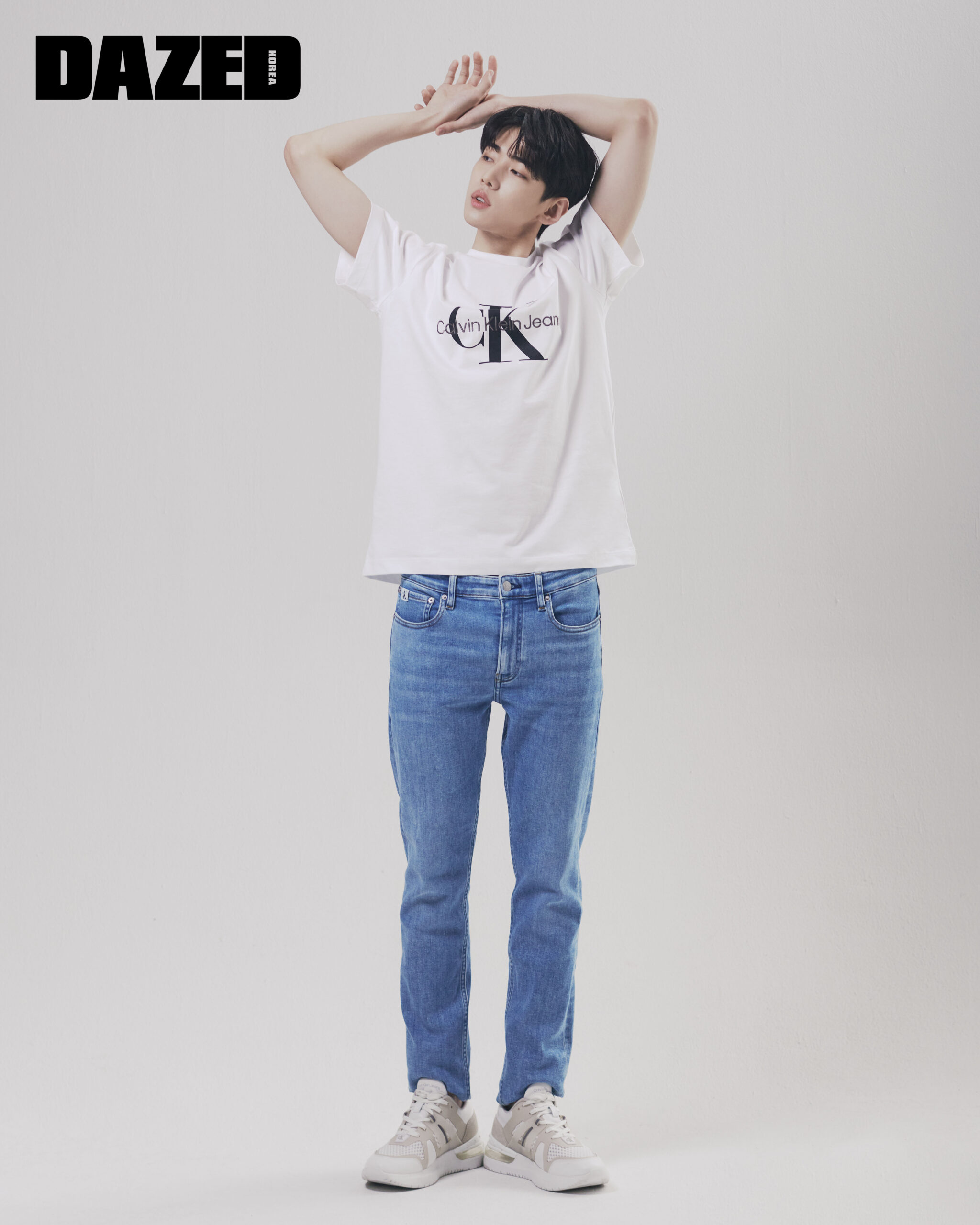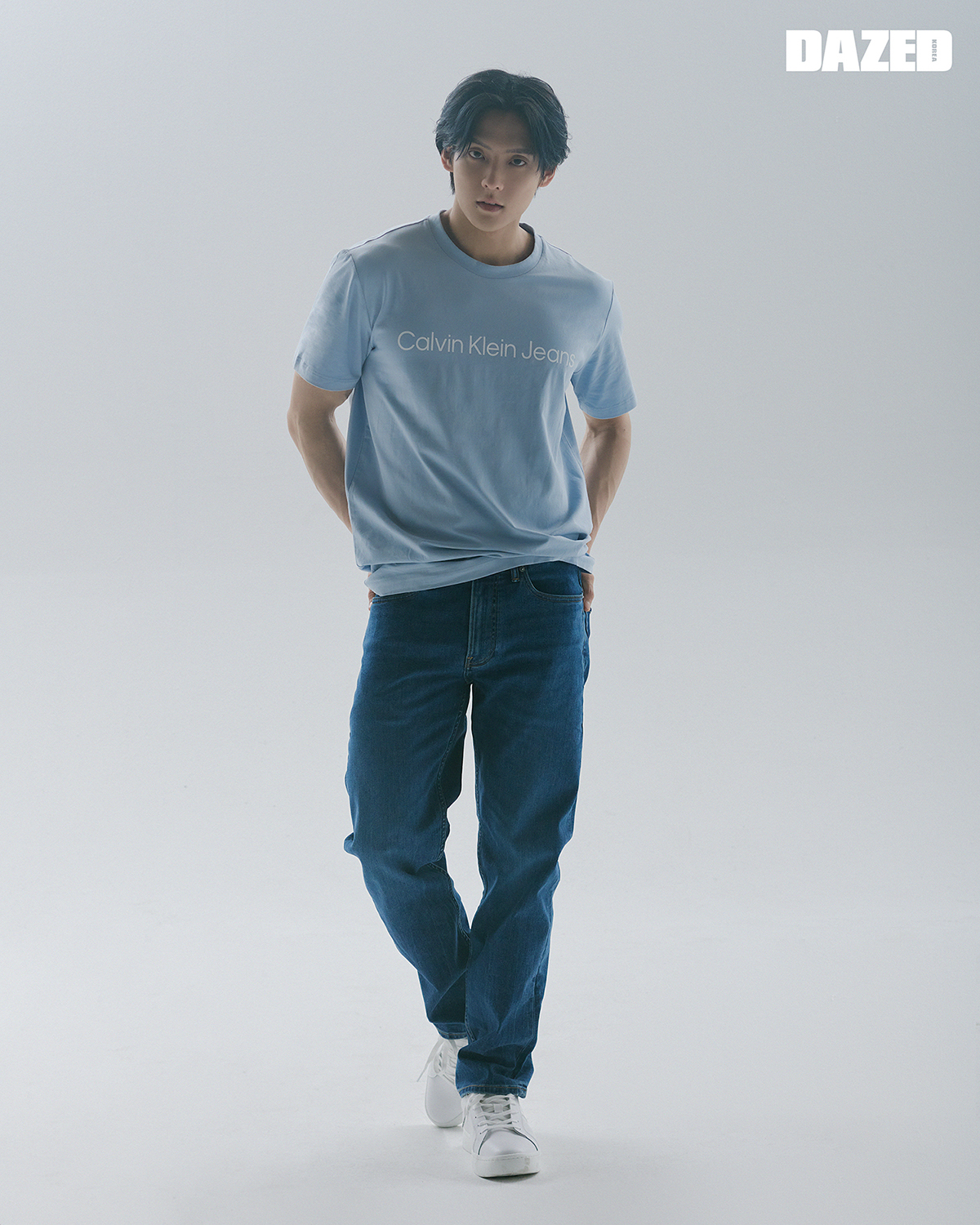베이쇼어 블루 컬러의 로고 티셔츠와 스트레이트 핏의 데님 팬츠는 캘빈클라인 (Calvin Klein Jeans), 화이트 컬러의 레더 스니커즈는 캘빈클라인 풋웨어(Calvin Klein Footwear).