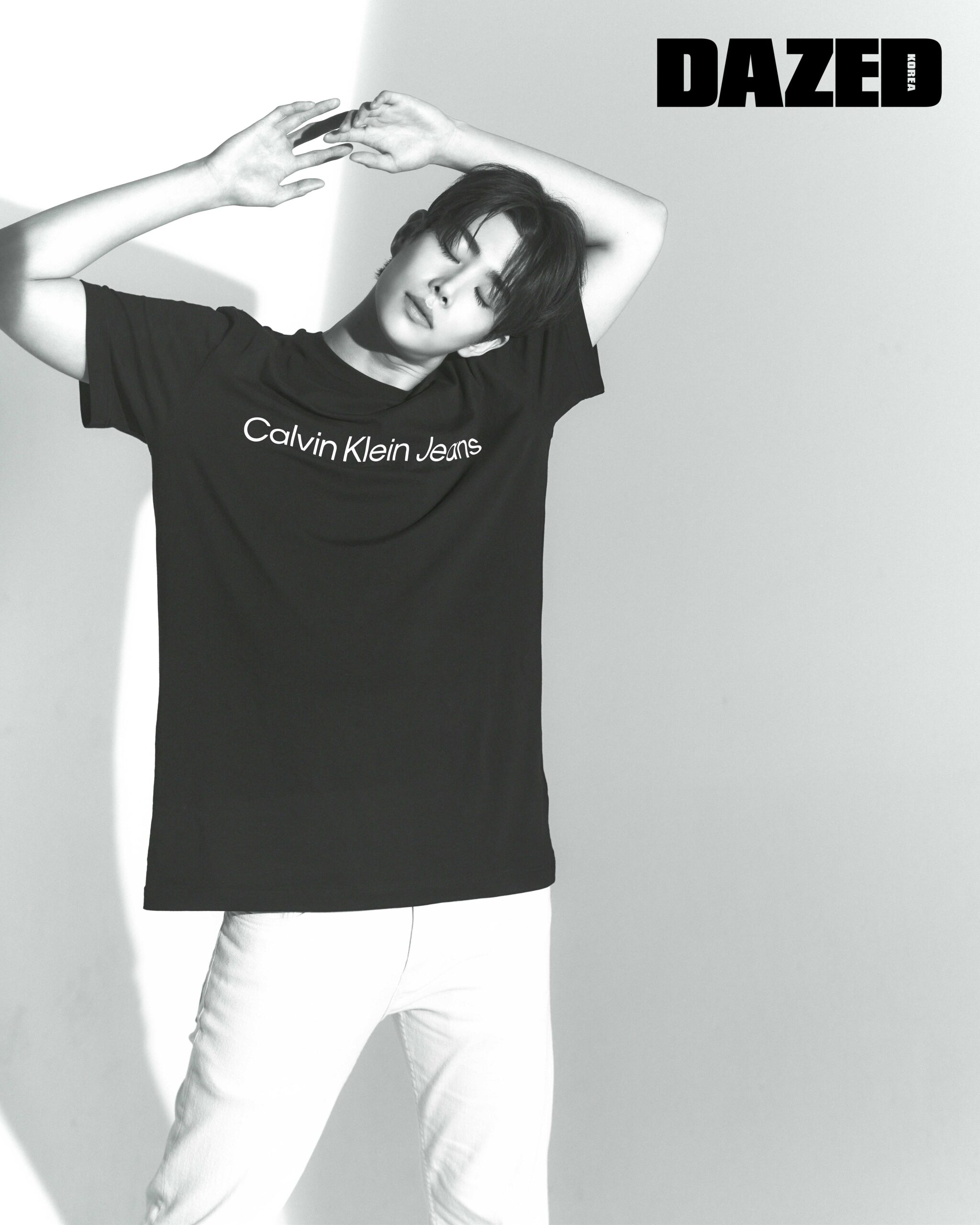 화이트 컬러의 모노그램 로고 티셔츠와 슬림 스트레이트 핏의 데님 팬츠는 캘빈클라인 (Calvin Klein Jeans), 화이트 컬러 베이스의 컬러 블록 스포티 러너 스니커즈는 캘빈클라인 풋웨어(Calvin Klein Footwear).