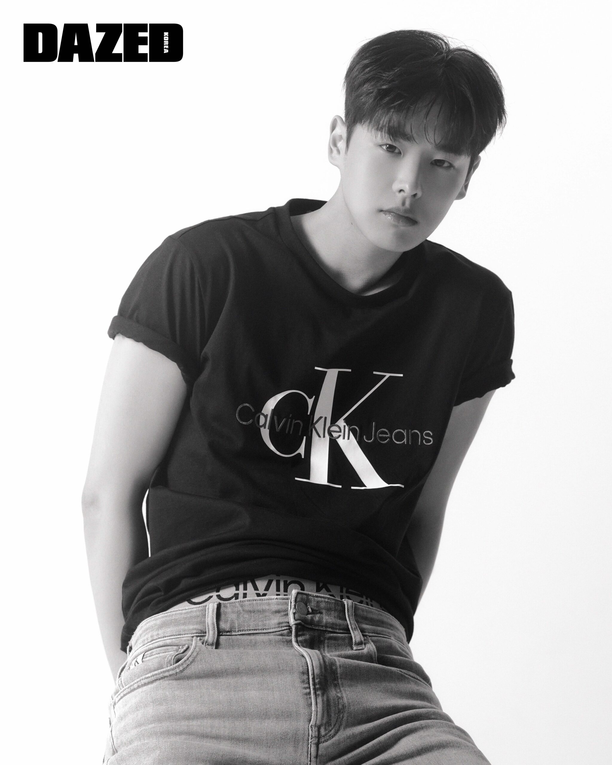 블랙 컬러의 모노그램 로고 티셔츠와 슬림 스트레이트 핏의 데님 팬츠는 캘빈클라인 진(Calvin Klein Jeans), 그레이 컬러의 트렁크는 캘빈클라인 언더웨어(Calvin Klein Underwear), 화이트 컬러의 레더 스니커즈는 캘빈클라인 풋웨어(Calvin Klein Footwear).