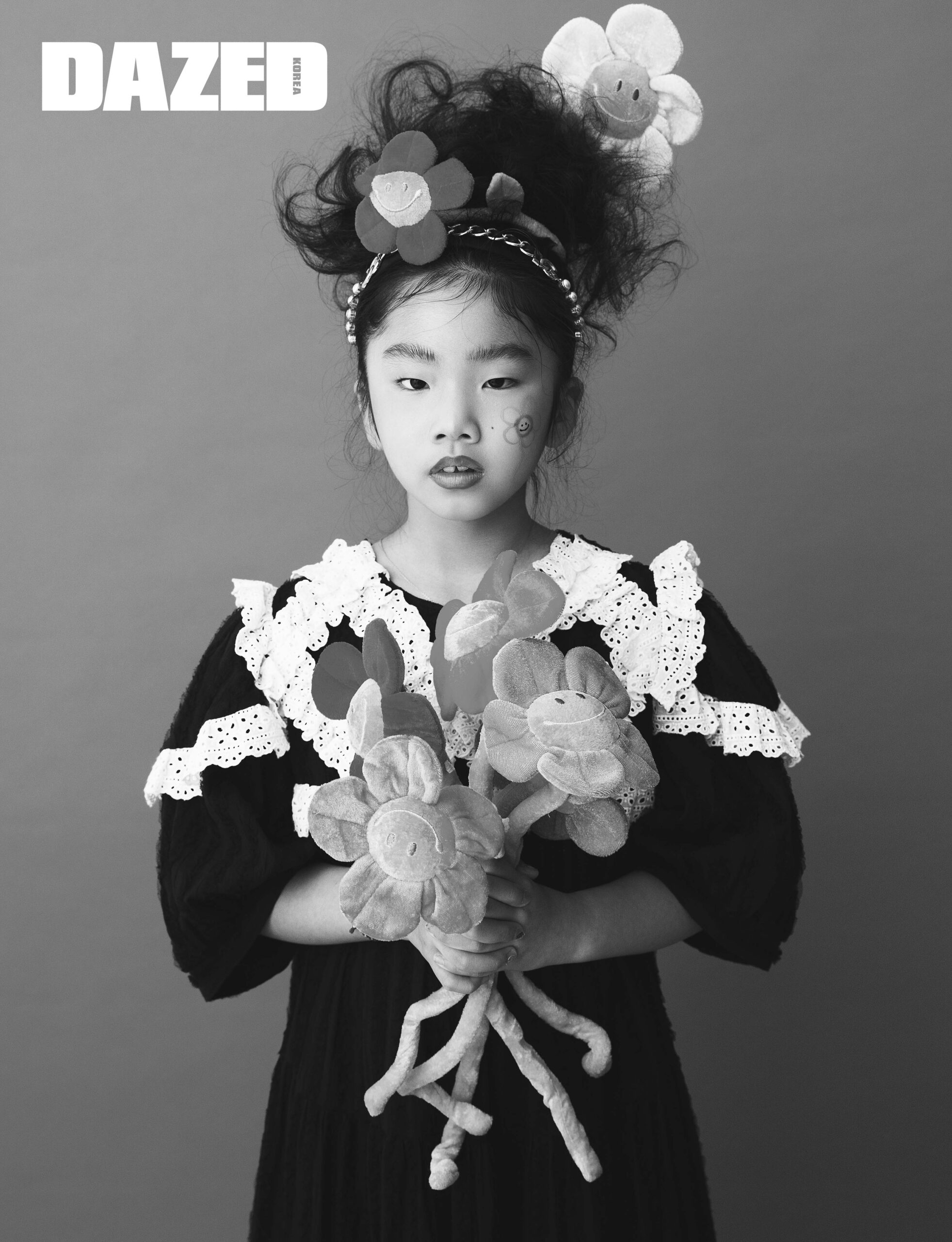 레이스 트리밍 디테일의 블랙 드레스는 듀이듀이(Dew E Dew E), 헤드 액세서리는 스타일리스트의 것.
