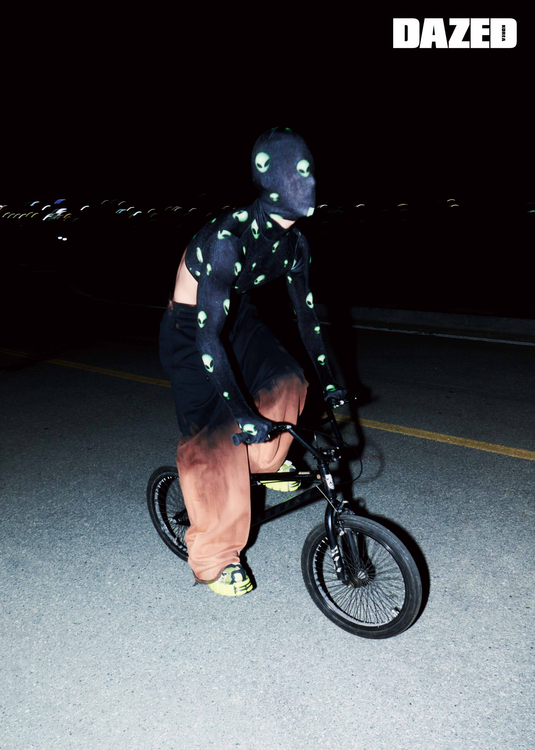 에일리언 프린트 크롭트 톱과 마스크, 타이다이 트레이닝 팬츠, 카무플라주 패턴 슈즈는 모두 베트멍(Vetements), 자전거는 에디터의 것.