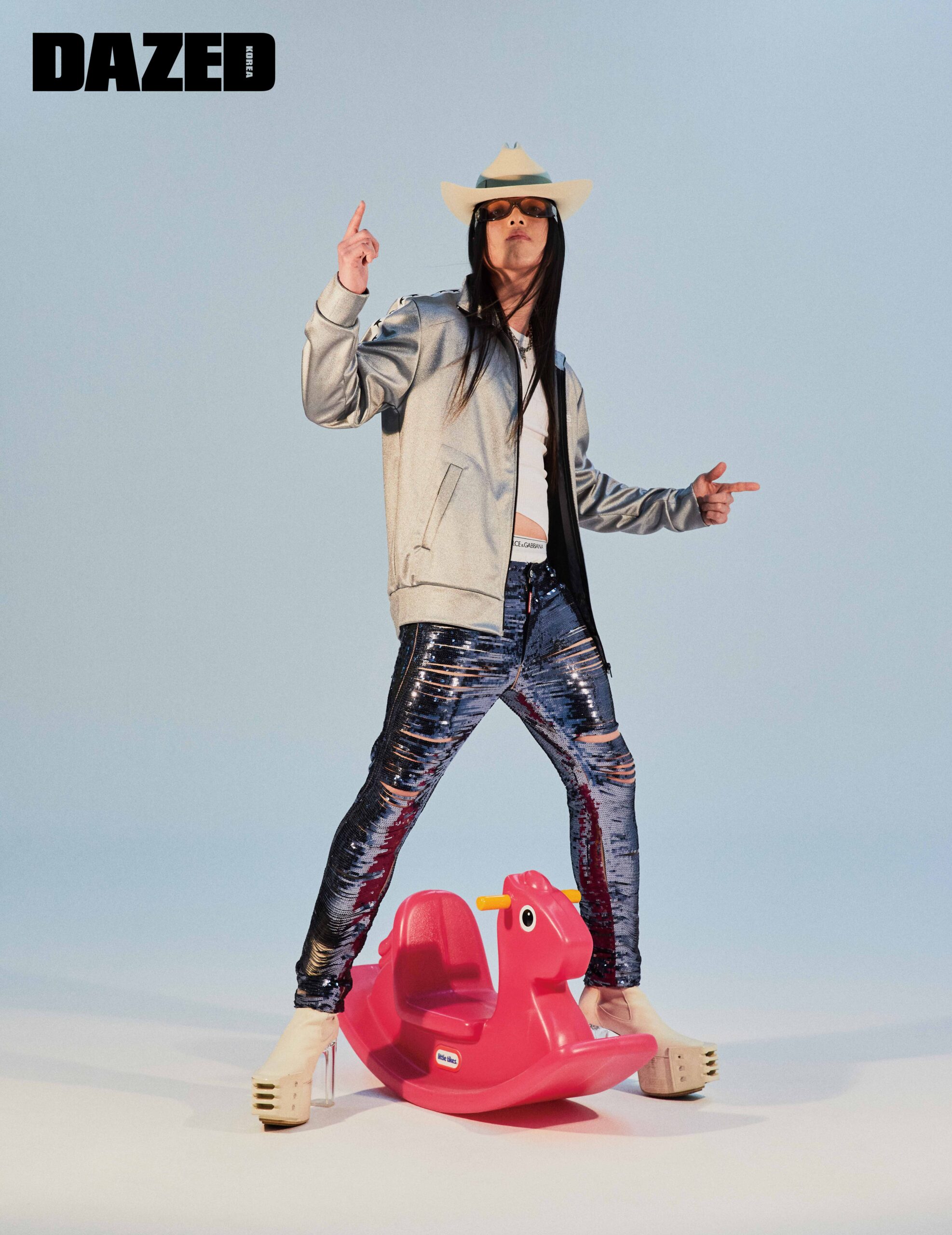 실버 저지 재킷은 골든구스(Golden Goose), 슬리브리스 톱은 에이치앤엠(H&M), 컷아웃 디테일의 시퀸 팬츠는 디스퀘어드2(Dsquared2), 플랫폼 앵클부츠는 릭 오웬스(Rick Owens), 페도라는 구찌(Gucci), 선글라스는 몽클레르+젠틀 몬스터(Moncler+Gentle Monster), 실버 네크리스는 오프화이트(Off-White™), 언더웨어는 돌체앤가바나(Dolce&Gabbana).