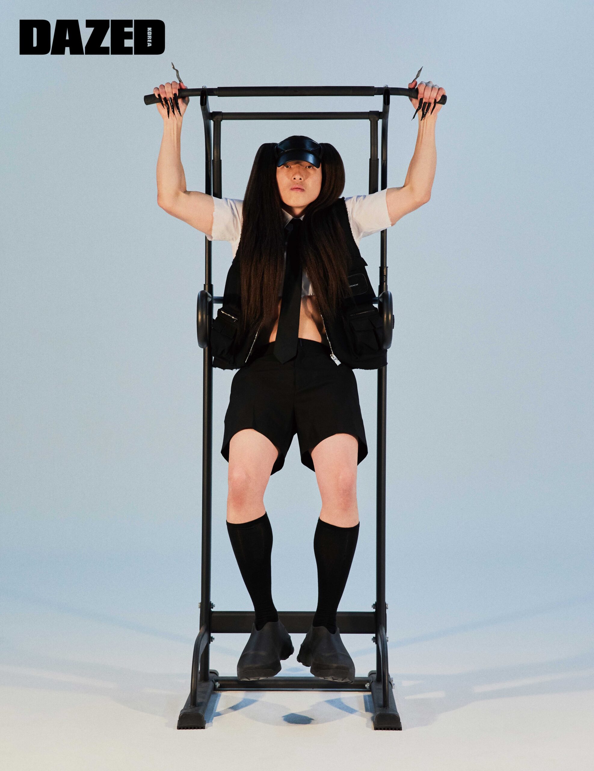 테크니컬 베스트와 쇼츠, 슈즈, 선바이저는 모두 지방시(Givenchy), 셔츠와 타이는 에디터의 것.