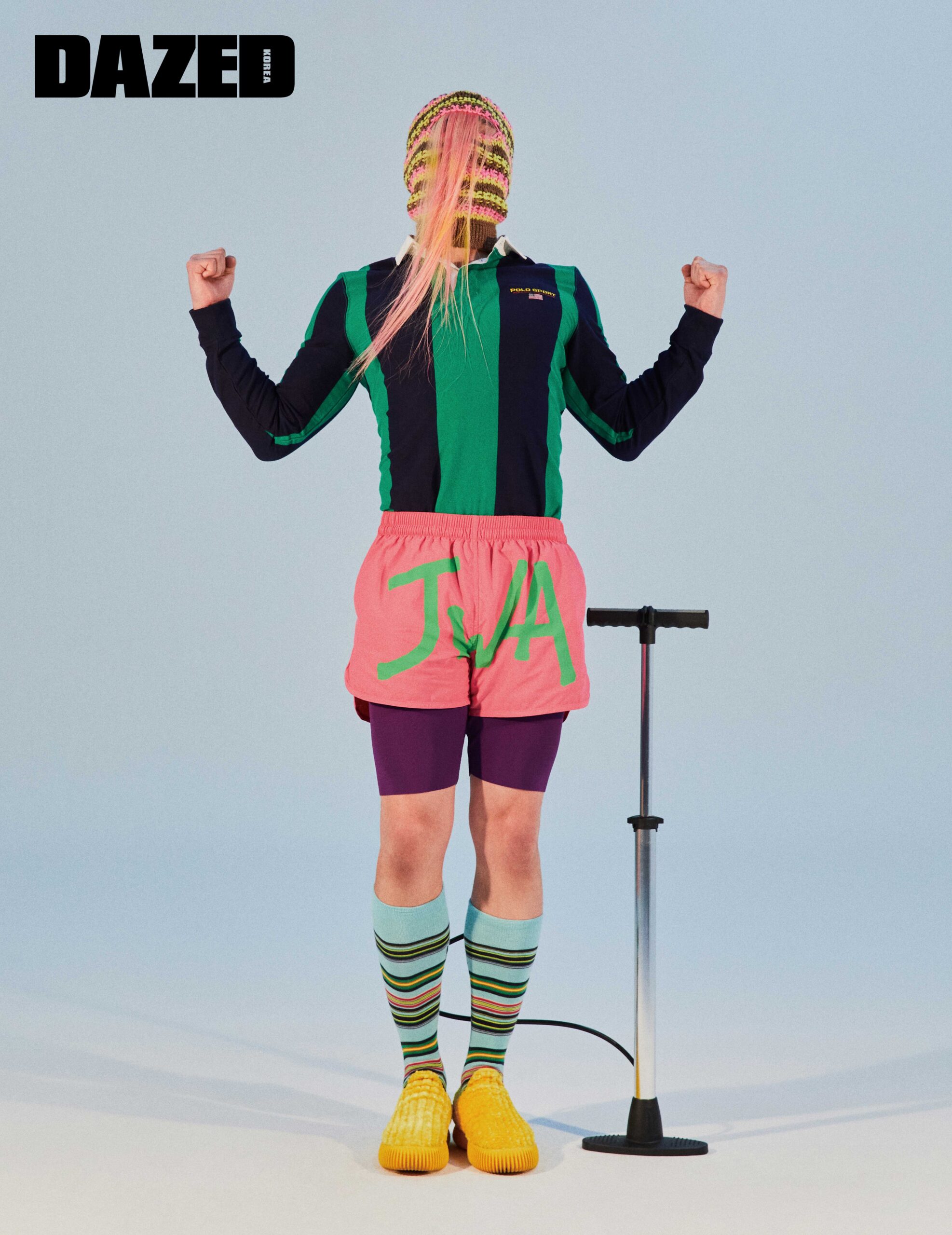 스트라이프 셔츠는 폴로 스포츠 바이 랄프 로렌(Polo Sport by Ralph Lauren), 쇼츠는 JW 앤더슨(JW Anderson), 슬립온은 보테가 베네타(Bottega Veneta), 발라클라바는 디스퀘어드2(Dsquared2), 하프 타이츠는 발렌티노(Valentino), 삭스는 에디터의 것.