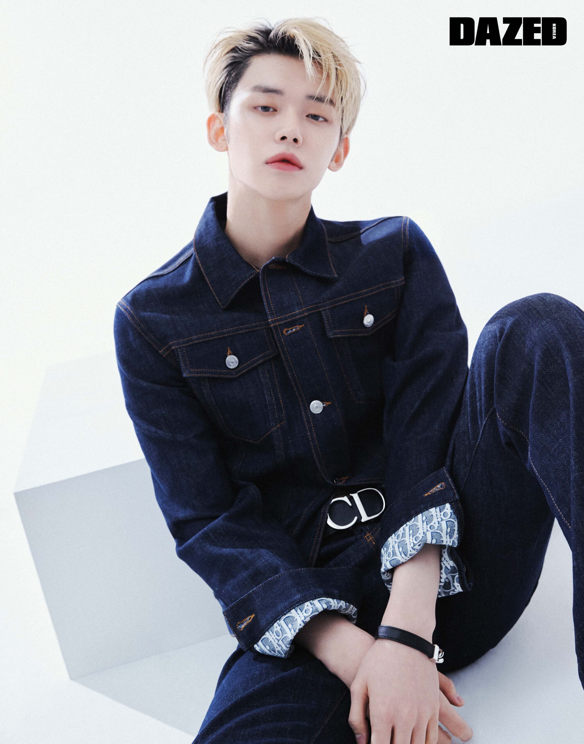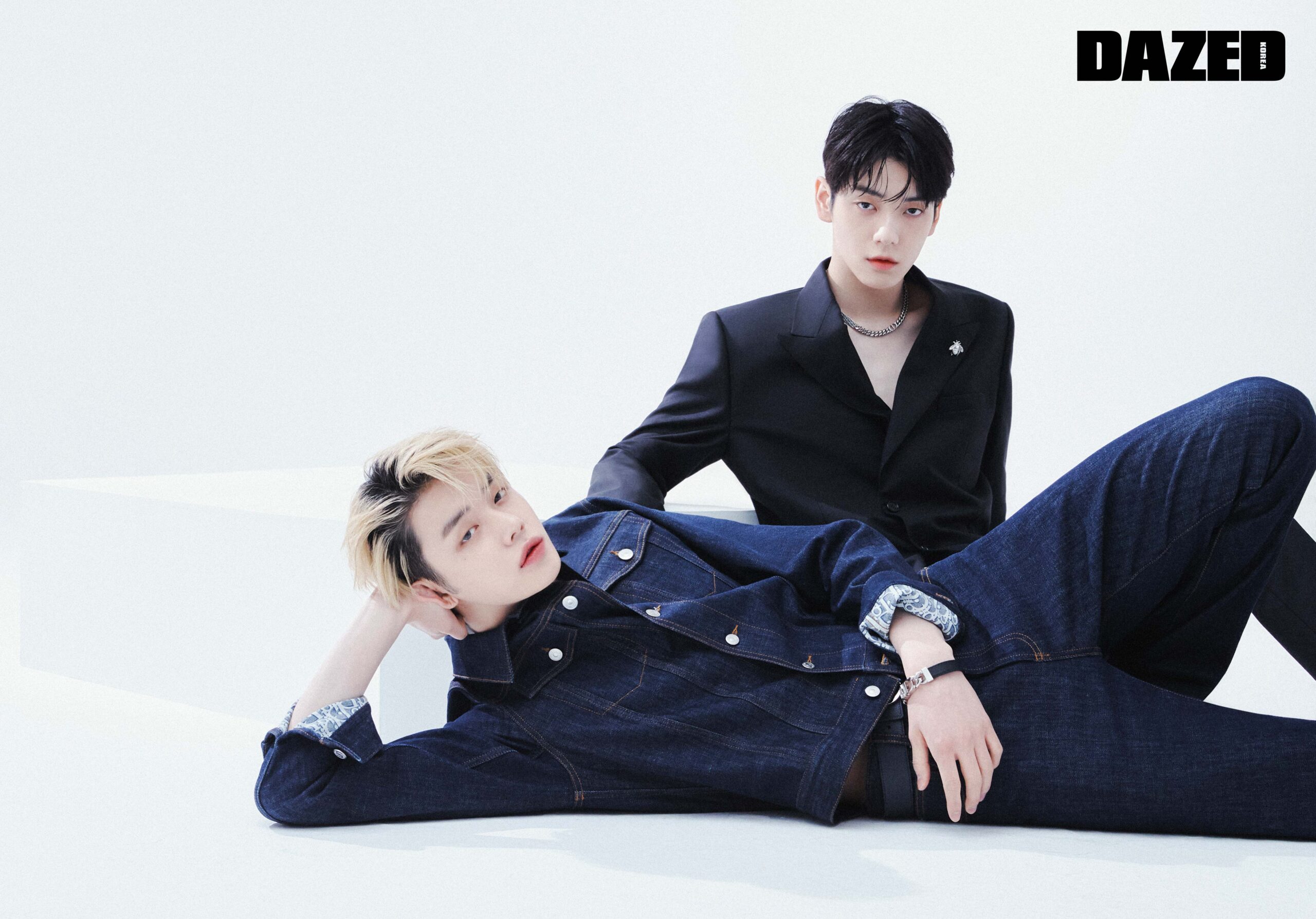 연준이 입은 디올 오블리크 프린트 장식의 블루종과 블루 코튼 데님 팬츠, 실버 버클 장식의 벨트, 실버 체인 링크 브레이슬릿은 모두 디올 맨(Dior Men). 수빈이 입은 꿀벌 모양 브로치 장식의 블랙 재킷과 실버 체인 링크 네크리스는 디올 맨(Dior Men).