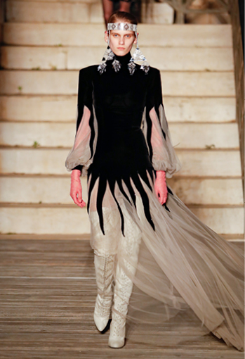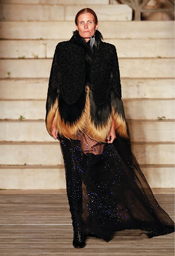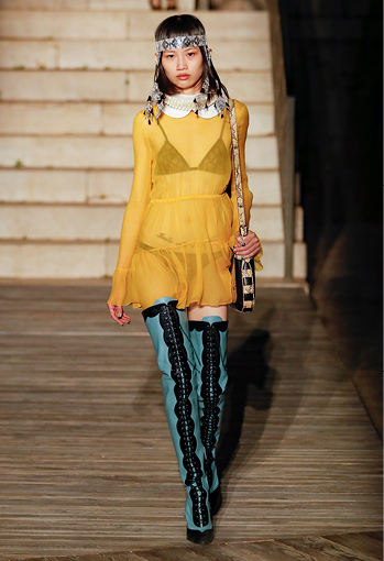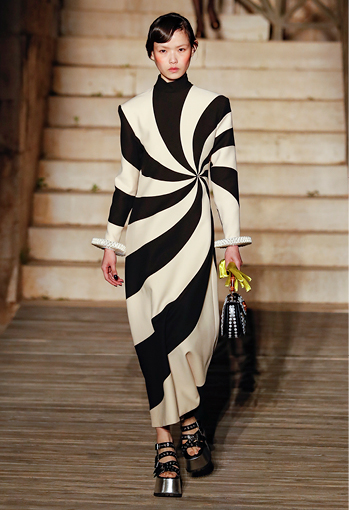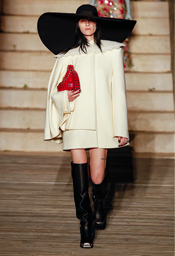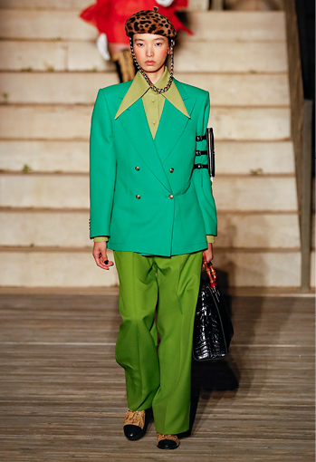 별을 품은 구찌의 절개가 한층 견고해졌다. 지난 겨울, 헐리우드에서 펼친 구찌 러브 퍼레이드 컬렉션에서는 호화로우면서도 열망하고픈 별을 그려낸 데에 반해, 이탈리아 중세의 유서 깊은 성채인 카스텔 델 몬테에서 펼쳐진 이 컬렉션은 문학과 천문학을 관통하는 판타지를 담는다. 구찌 코스모고니(우주기원론) 컬렉션은 알레산드로 미켈레에게 특별한 영감을 준 독일 사상가 발터 벤야민Walter Benjamin의 ‘별자리식 사유’라는 개념에서 시작된다. 어두운 밤, 조명 아래 피어오르는 연기 사이로 모델들이 팔각형의 성채를 돌며 쇼가 진행되었다. 화려한 시각적 패턴, 시스루 드레스, 엠브로이더리가 돋보이는 가운과 맨즈웨어, 기하학적인 실루엣 등 정해진 규범 없이 옷의 자유로움을 극대화하고 이에 화려한 액세서리들이 더해져 무대를 빛냈다. 여덟 개의 기둥을 잇는 커다란 별 형태의 선과 성채에 비친 밤하늘의 별자리는 모든 것이 이어져 있음을 나타내며 그 아래에서 신화적인 구찌의 소우주가 창조되었다. 이 진풍경에 구찌의 글로벌 앰버서더 신민아도 참석해 반짝임을 더했다.