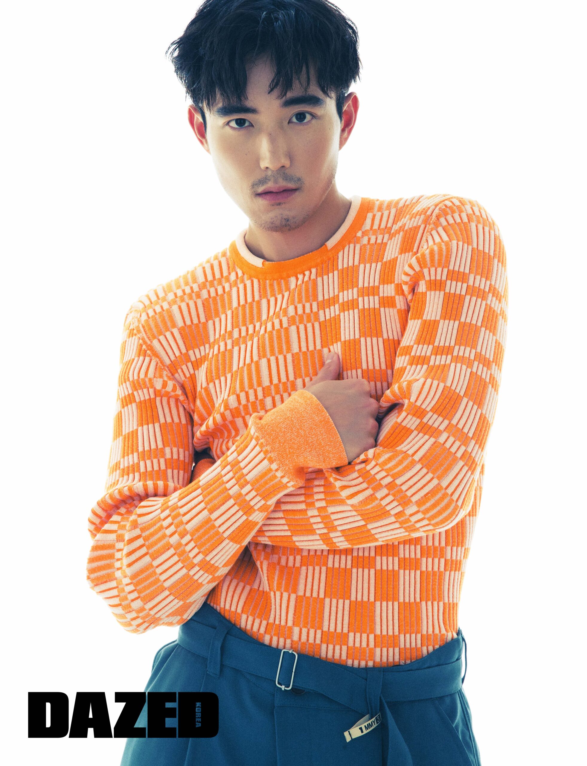 독특한 패턴의 니트 톱은 자크뮈스 by 분더샵(Jacquemus by BOONTHESHOP), 벨티드 와이드 팬츠는 미하라 야스히로 by 분더샵(Mihara Yasuhiro by BOONTHESHOP).