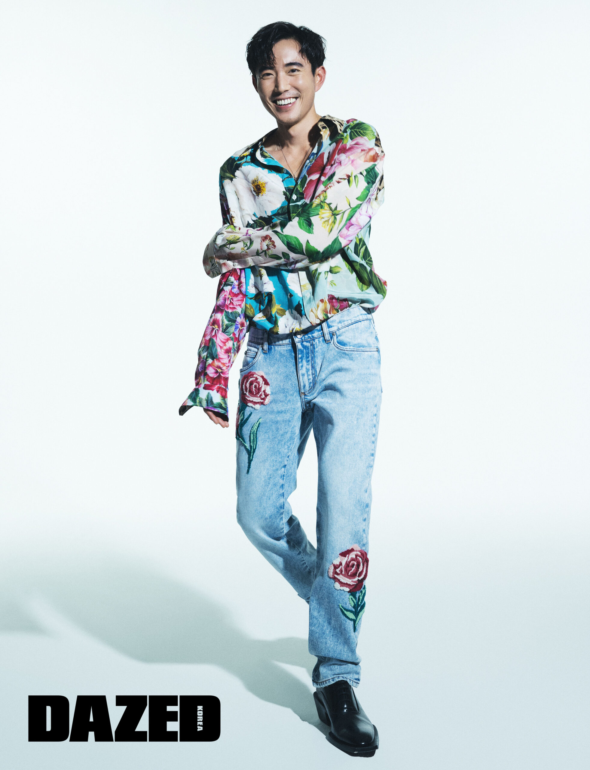 플라워 패턴의 셔츠와 데님 팬츠, 슈즈는 모두 돌체앤가바나(Dolce&Gabbana), 실버 체인 네크리스는 펜디(Fendi).
