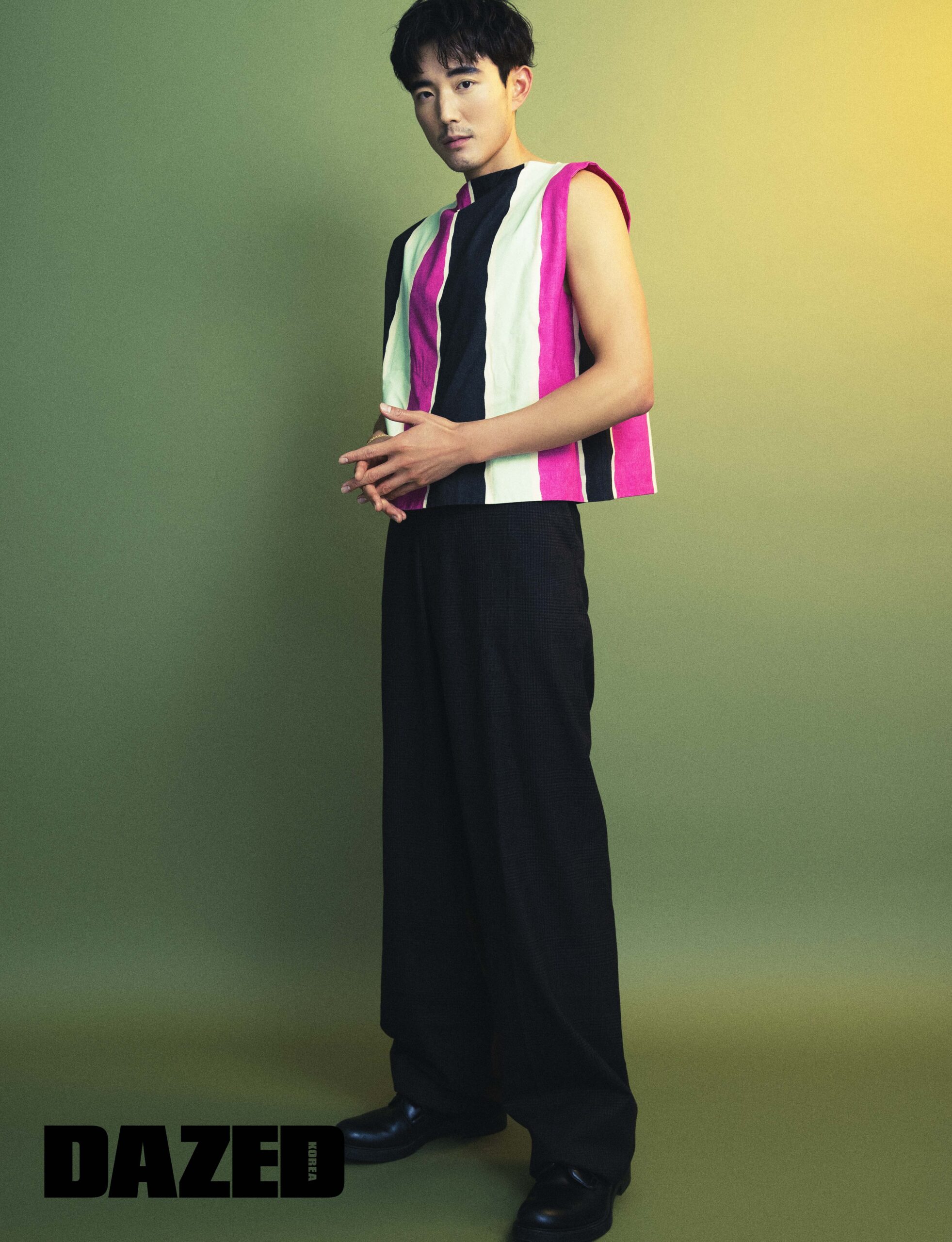 스트라이프 패턴의 슬리브리스 톱과 팬츠, 더비 슈즈는 모두 프라다(Prada), 골드 체인 브레이슬릿은 돌체앤가바나(Dolce&Gabbana).