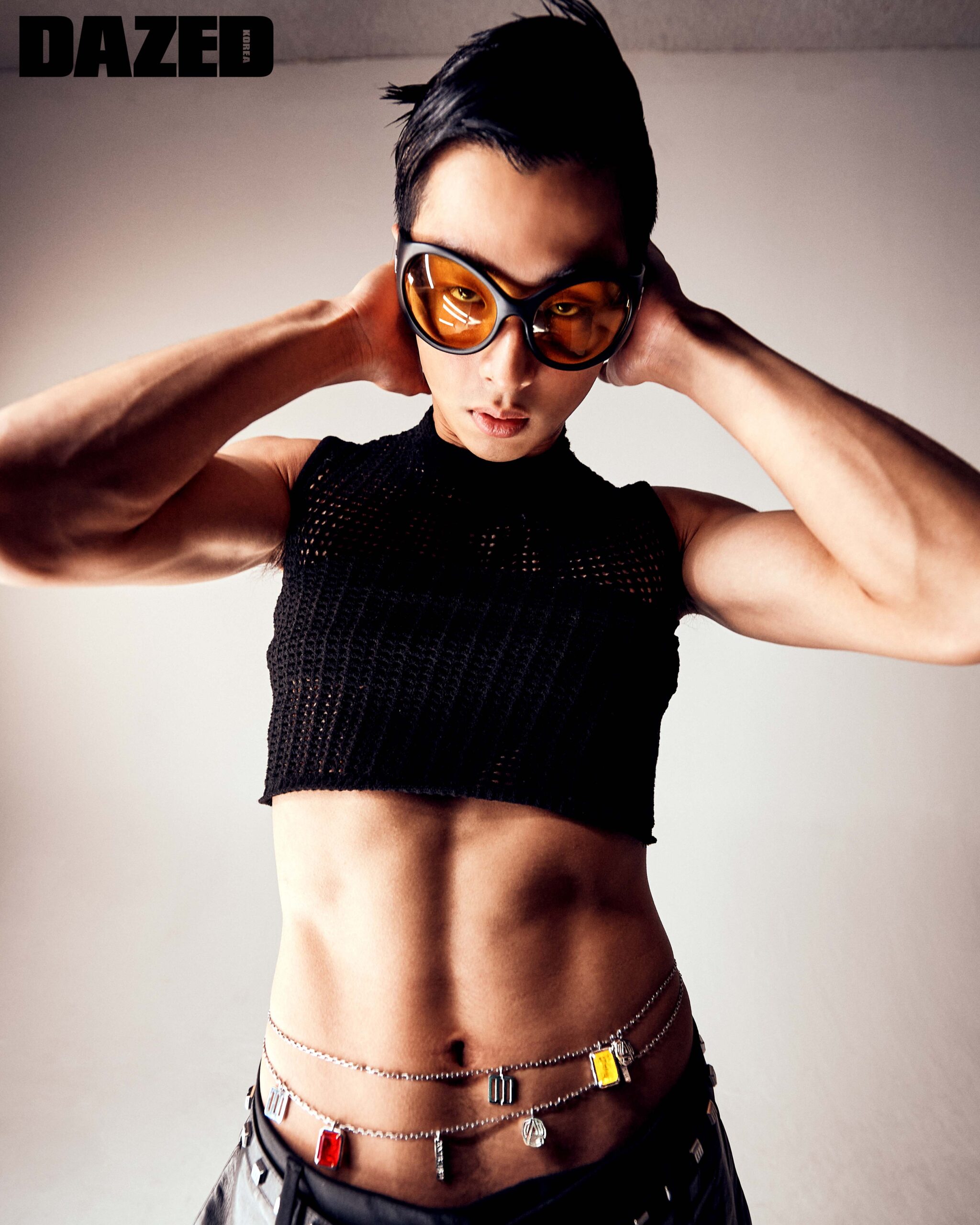 벨리 체인으로 연출한 스퀘어컷 옐로 스톤 네크리스와 스퀘어 컷 레드 스톤 네크리스, 터틀텍 니트 메시 톱, 블랙 팬츠, 딥테라 모티브 틴티드 선글라스, 스터드 디테일 벨트는 모두 엠부쉬(Ambush).