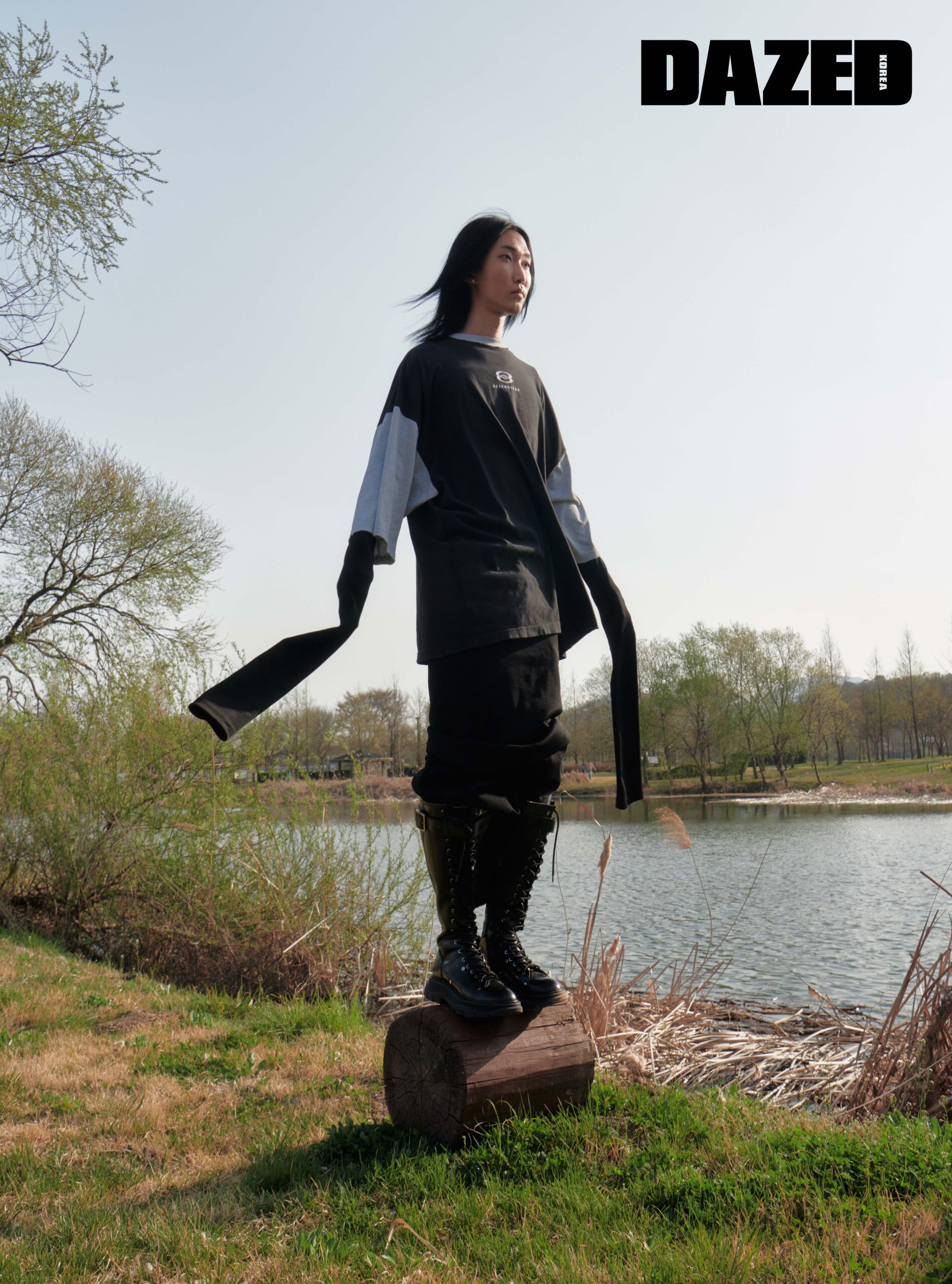배색 디테일의 티셔츠와 이너로 레이어링한 롱 스트레치 톱, 라지 배기 진은 모두 발렌시아가(Balenciaga), 트레드 레이스업 부츠는 알렉산더 맥퀸(Alexander McQueen).