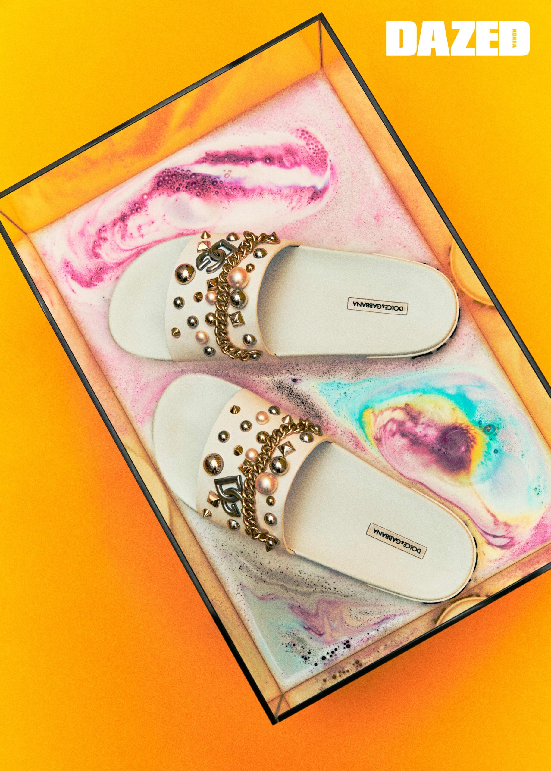 스터드, 펄, 체인, 메탈 로고가 돋보이는 러버 비치웨어 슬라이드 샌들은 돌체앤가바나(Dolce&Gabbana).