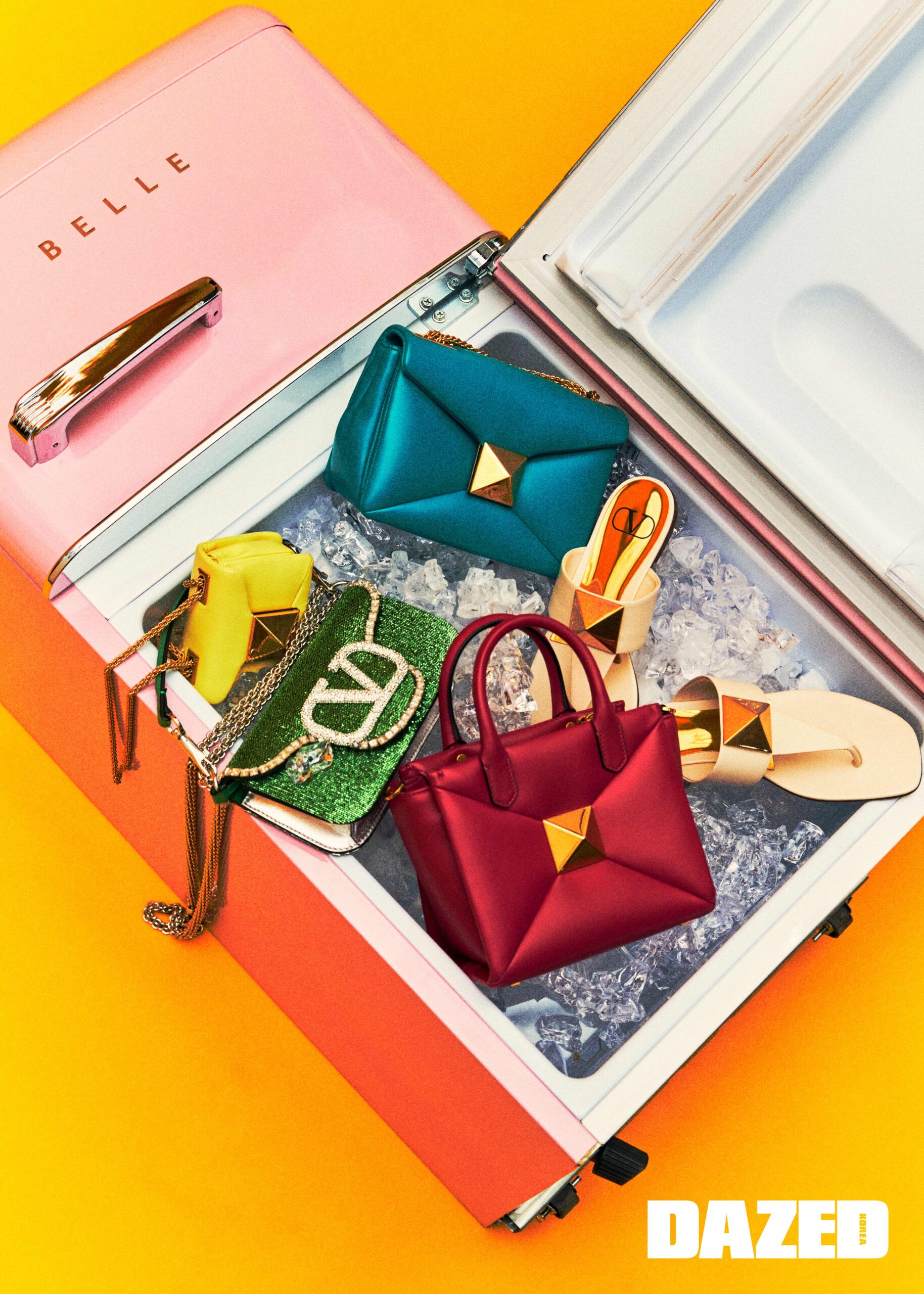 스터드 디테일의 앞면 잠금이 특징인 울트라 머린 그린 컬러의 나파 레더 원 스터드 체인 백과 원 스터드 슬라이드, 앞면의 커다란 스터드 디테일이 특징인 블로섬 컬러의 나파 레더 원 스터드 톱 핸들 백, 그린 컬러의 시퀸 소재가 특징인 비즈 로코 미니 백, 스터드 디테일의 잠금장치가 특징인 옐로 컬러의 마이크로 사이즈 나파 레더 원 스터드 체인 백은 모두 발렌티노 가라바니(Valentino Garavani).