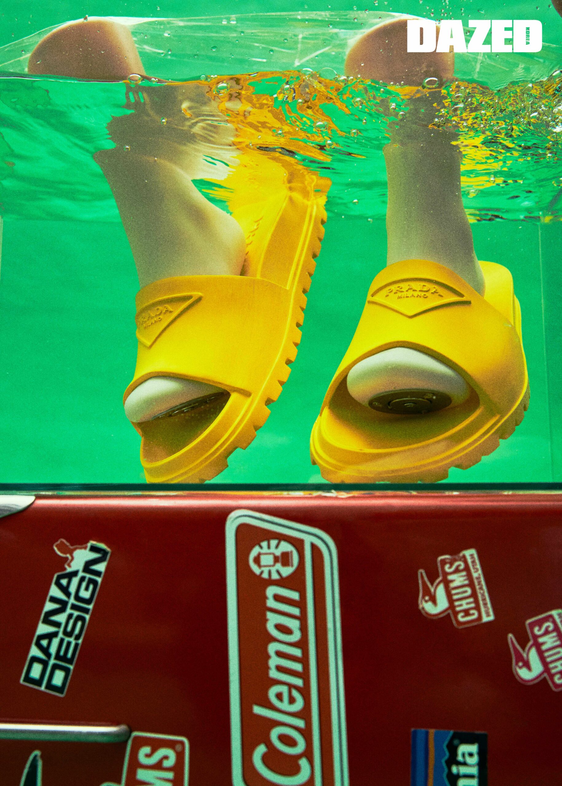 전면의 엠보싱 트라이앵글 로고가 돋보이는 서니 옐로 컬러의 러버 슬라이드는 프라다(Prada).