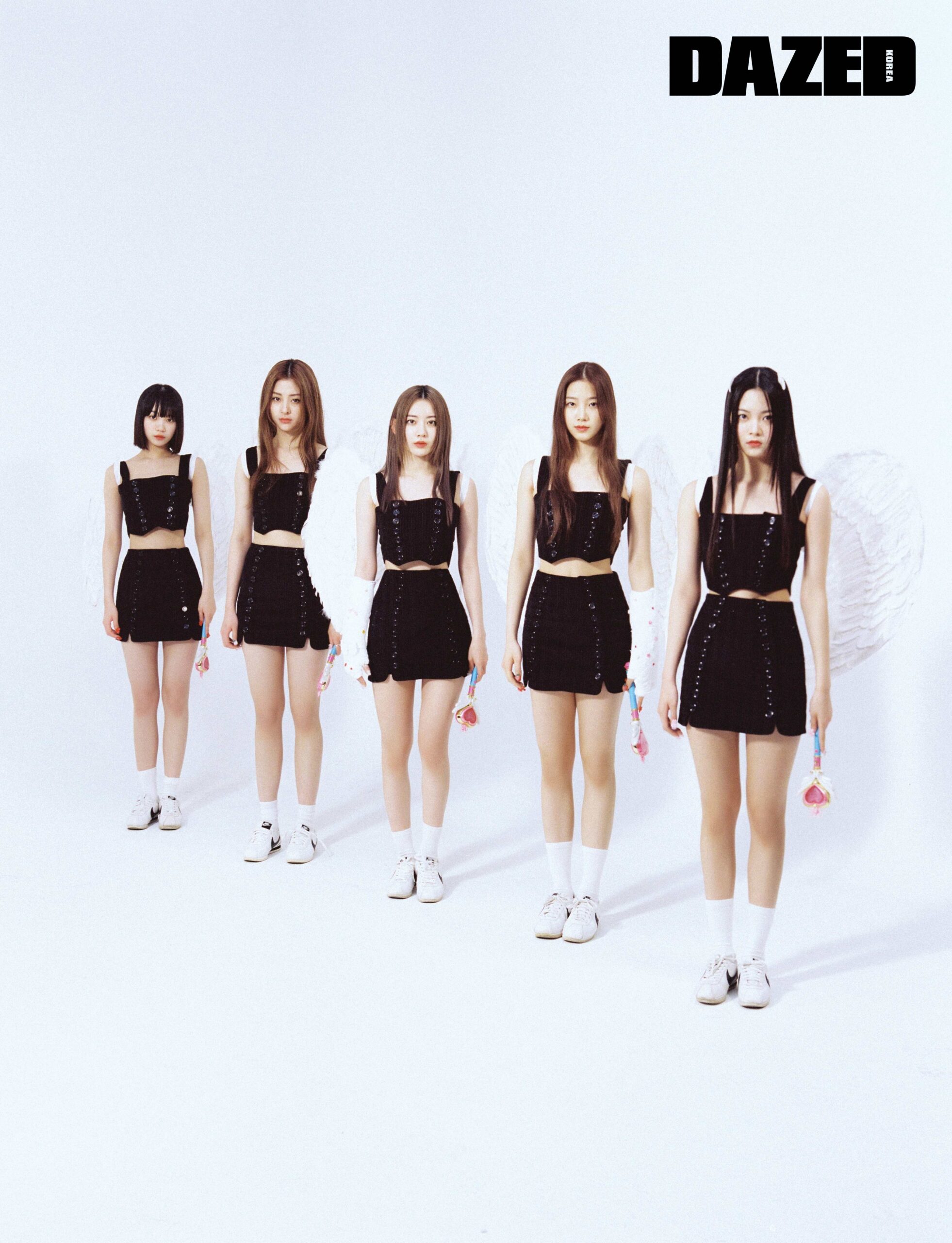 채원, 윤진, 사쿠라, 카즈하, 은채가 입은 단추 디테일 슬리브리스 톱과 스커트는 모두 145오피스(145office), 슈즈와 삭스는 모두 에디터의 것. 윤진이 착용한 링은 윤진의 것.