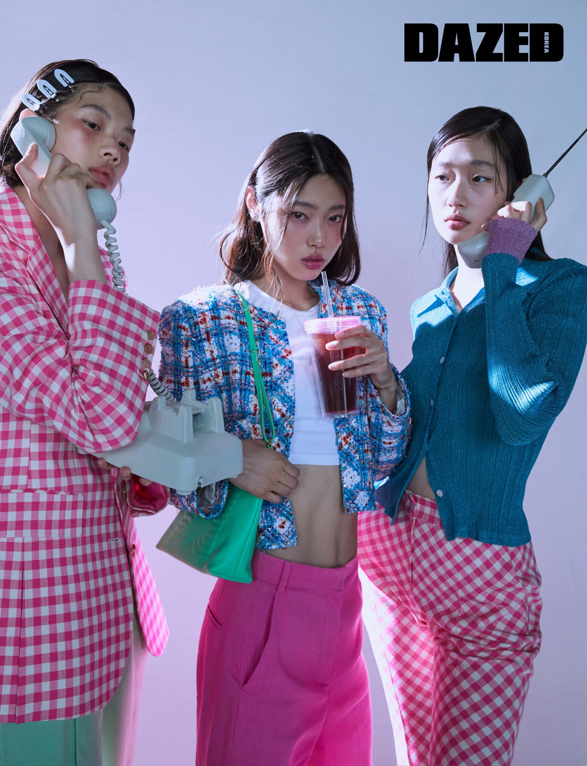 주영이 입은 핑크 컬러의 체크 패턴 싱글브레스트 재킷과 라이트 그린 컬러 와이드 팬츠는 잉크(EENK). 예진이 입은 블루 컬러의 트위드 재킷과 핑크 컬러의 와이드 팬츠, 엠보싱이 돋보이는 미니 파우치 숄더백은 모두 잉크(EENK), 이너로 입은 크롭트 톱은 에디터의 것. 윤아가 입은 배색 커프스가 특징인 플리츠 니트 셔츠와 핑크 컬러의 체크 패턴 팬츠는 잉크(EENK).