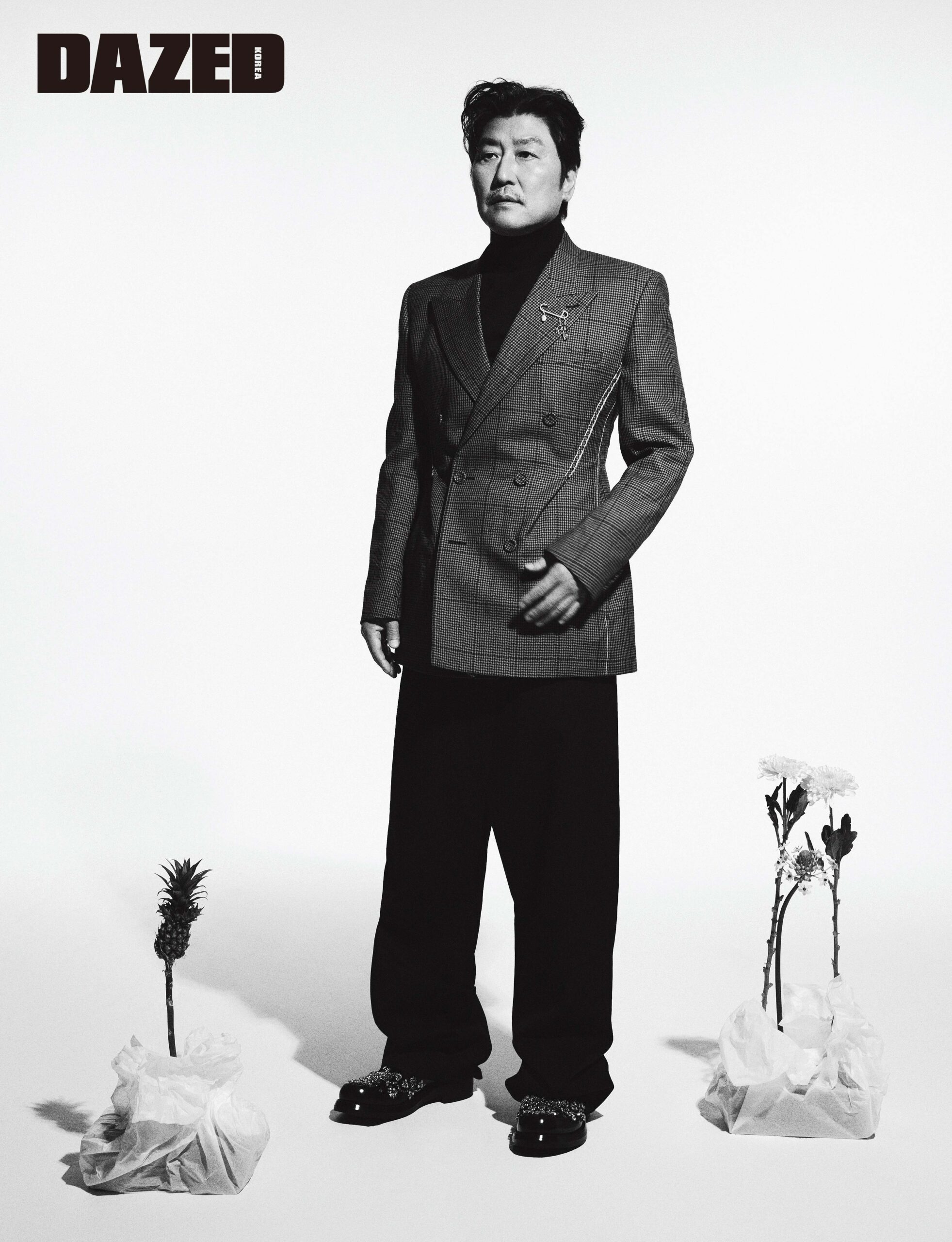 그레이 컬러의 체크 패턴 재킷과 이너로 입은 하이넥 스웨터, 블랙 와이드 트라우저, 주얼리 장식의 더비 슈즈, CD 이니셜 디테일 브로치는 모두 디올 맨(Dior Men).