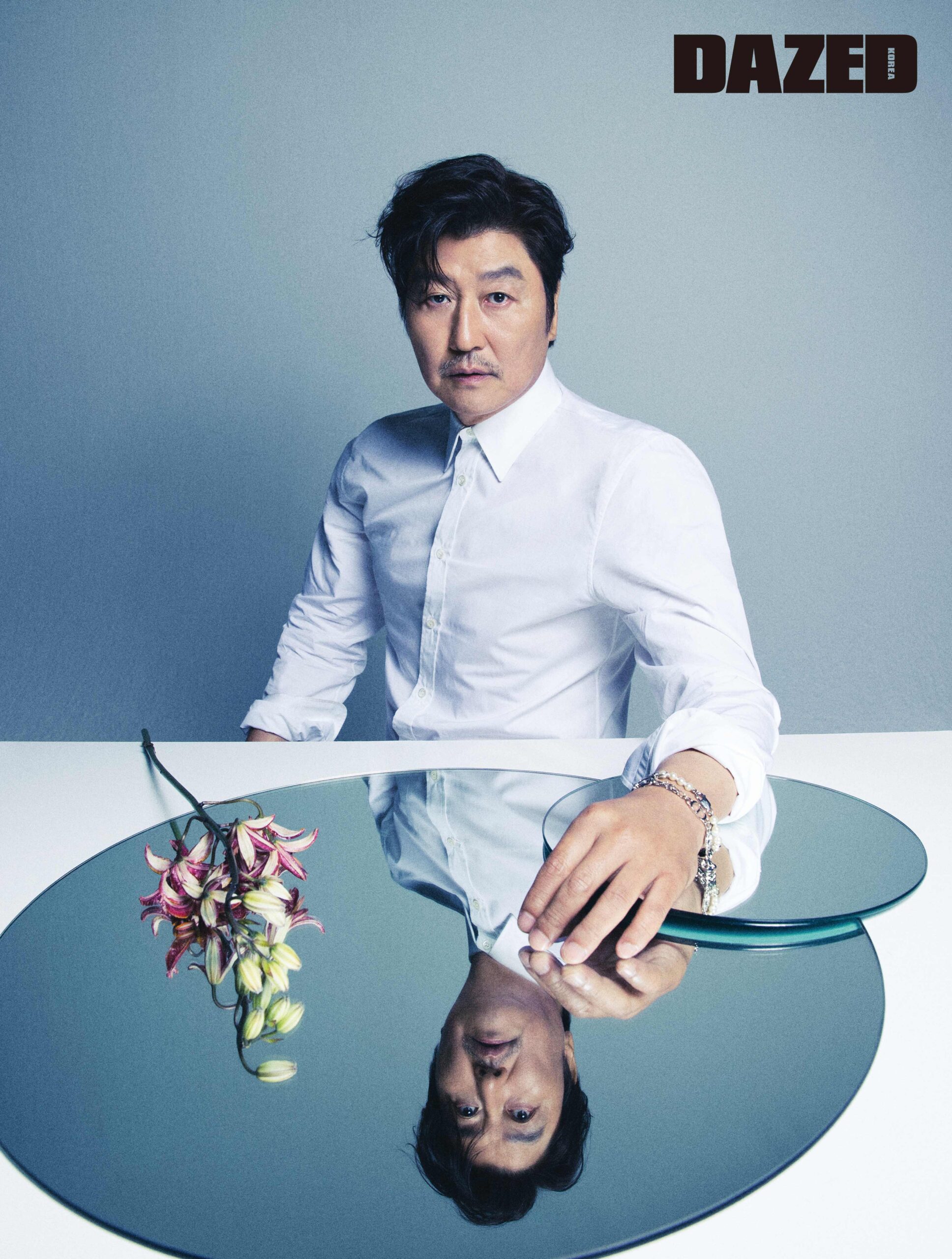 화이트 코튼 셔츠는 알렉산더 맥퀸(Alexander McQueen), CD 로고 브레이슬릿은 디올 맨(Dior Men), 펄 장식의 브레이슬릿은 펜디(Fendi).