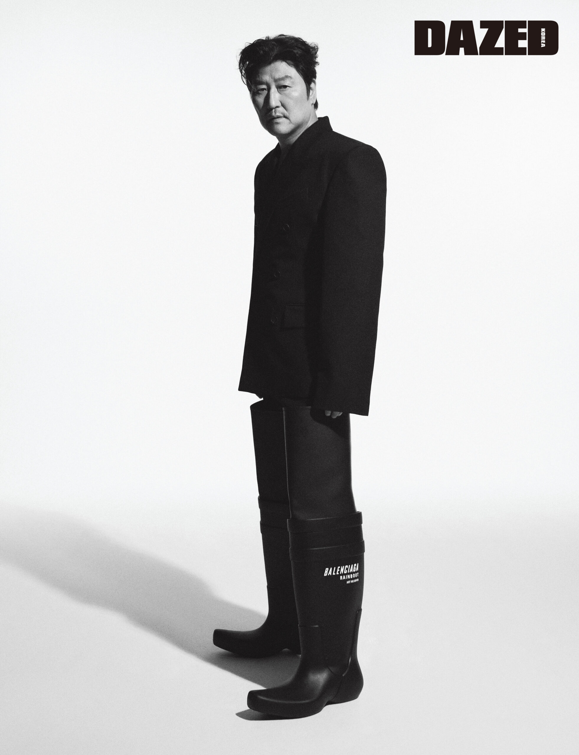 블랙 배러시아 웨이스티드 재킷과 테일러드 플레어 팬츠, 러버 레인 부츠는 모두 발렌시아가(Balenciaga).