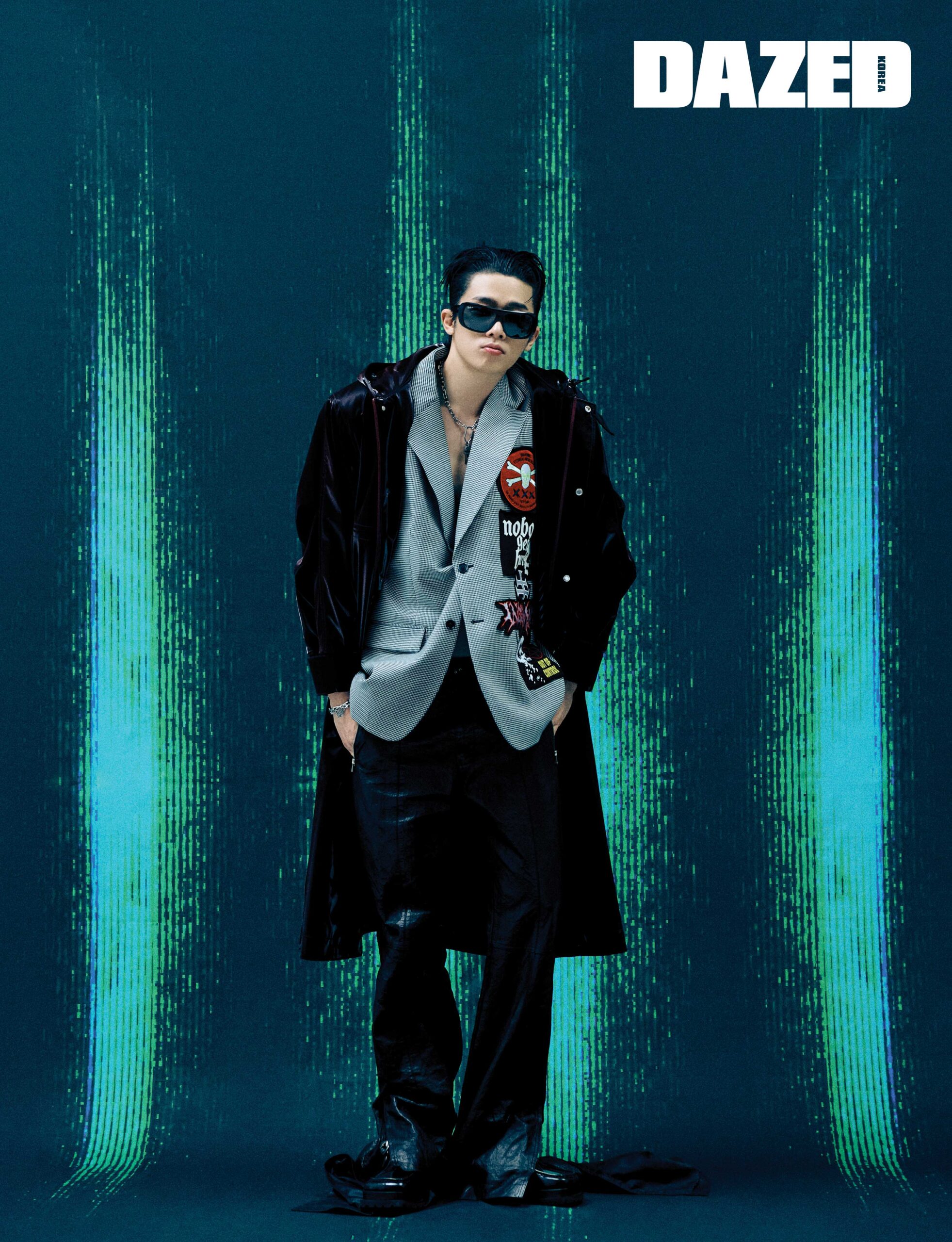 그러데이션 코트와 팬츠는 김서룡(Kimseoryong), 블랙 스퀘어 네트 슬라이드는 렉토(Recto), 실버 체인 네크리스는 이스트 아이스(East Ice).