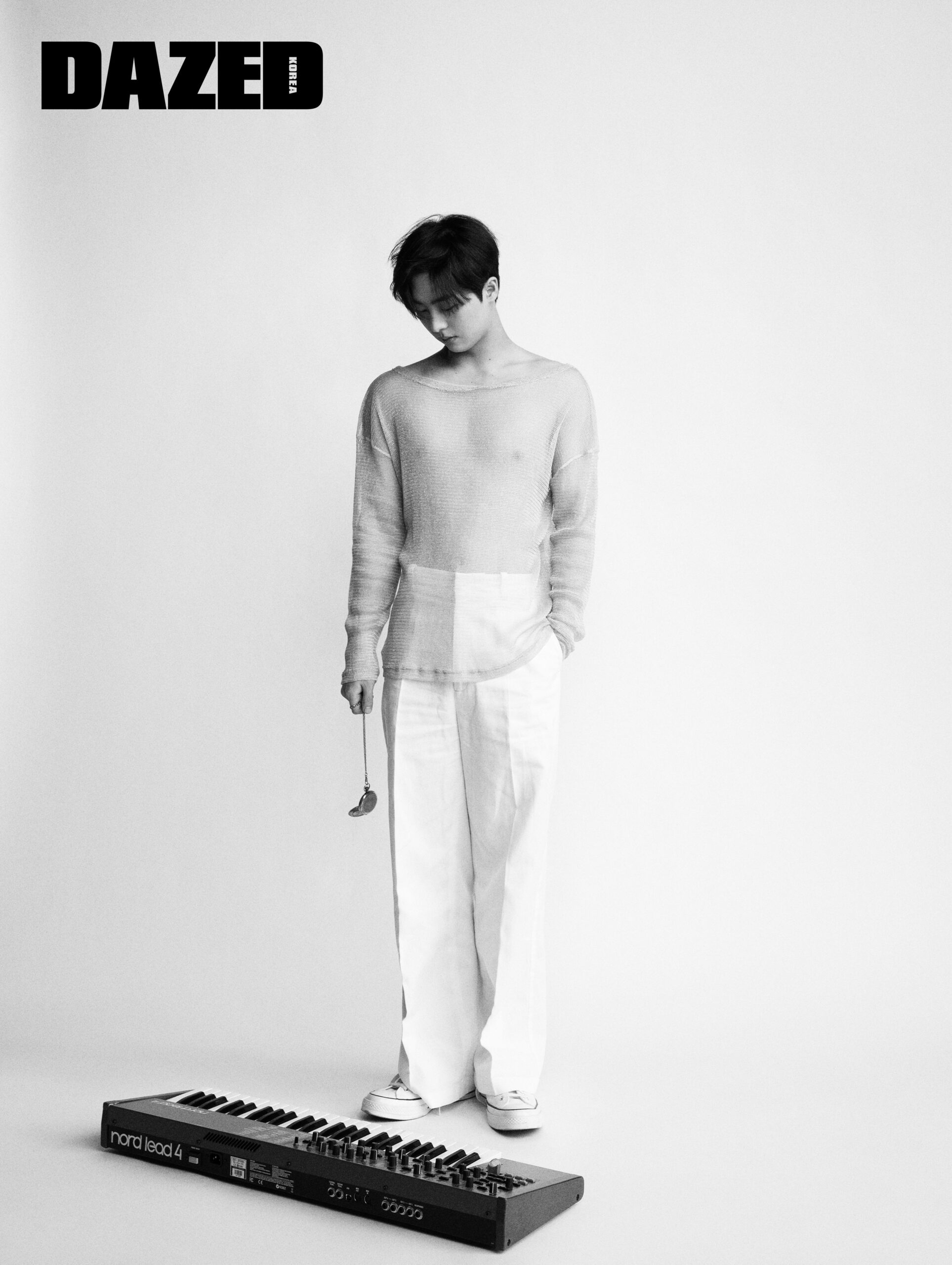 화이트 메시 톱은 엘이이와이(L.e.e.y), 화이트 팬츠는 아크네 스튜디오 by 10 꼬르소 꼬모 서울(Acne Studios by 10 Corso Como Seoul), 스니커즈는 컨버스(Converse).