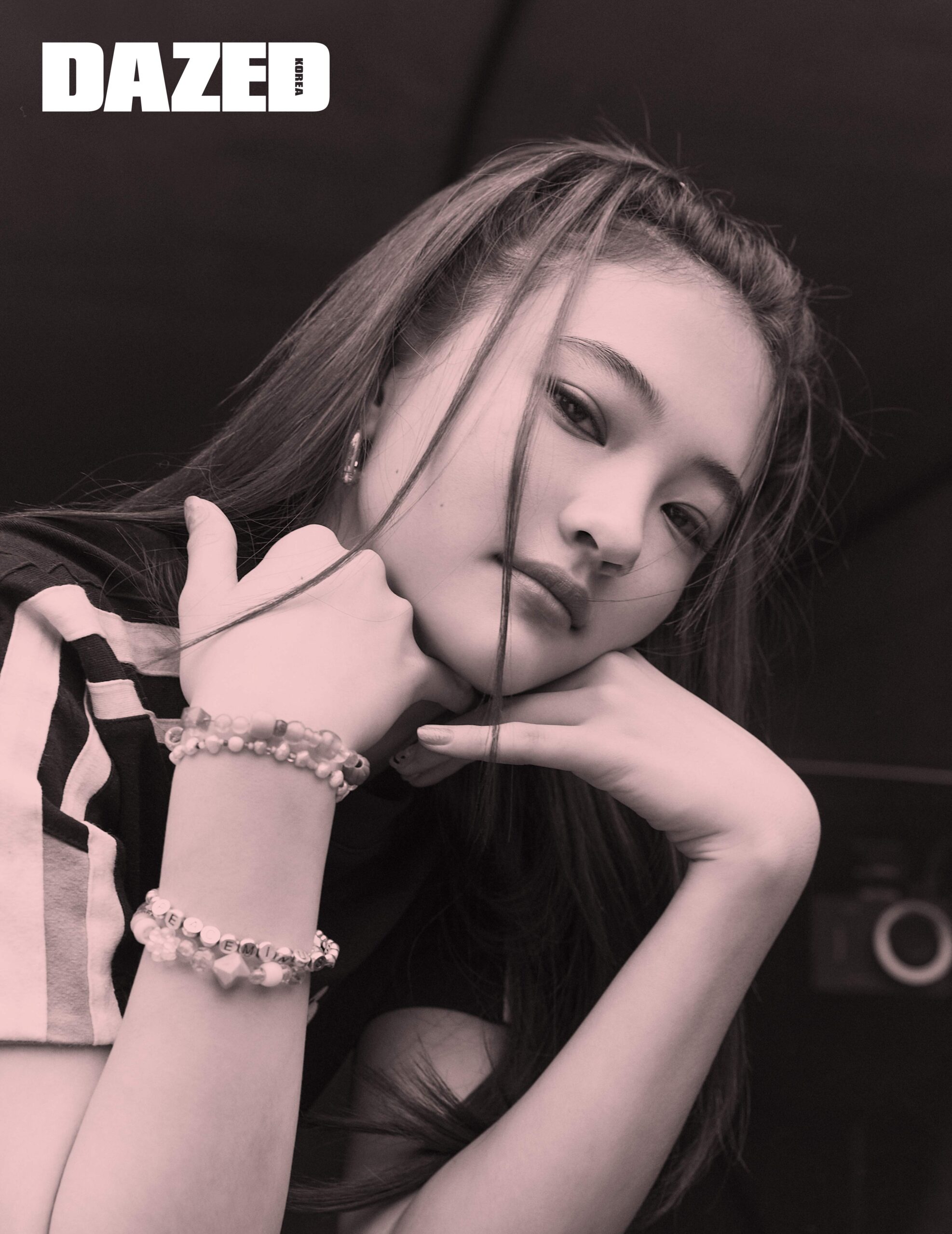 블랙 피티드 톱과 이어링은 발렌시아가(Balenciaga), 레이어링한 모든 브레이슬릿은 스타일리스트의 것.