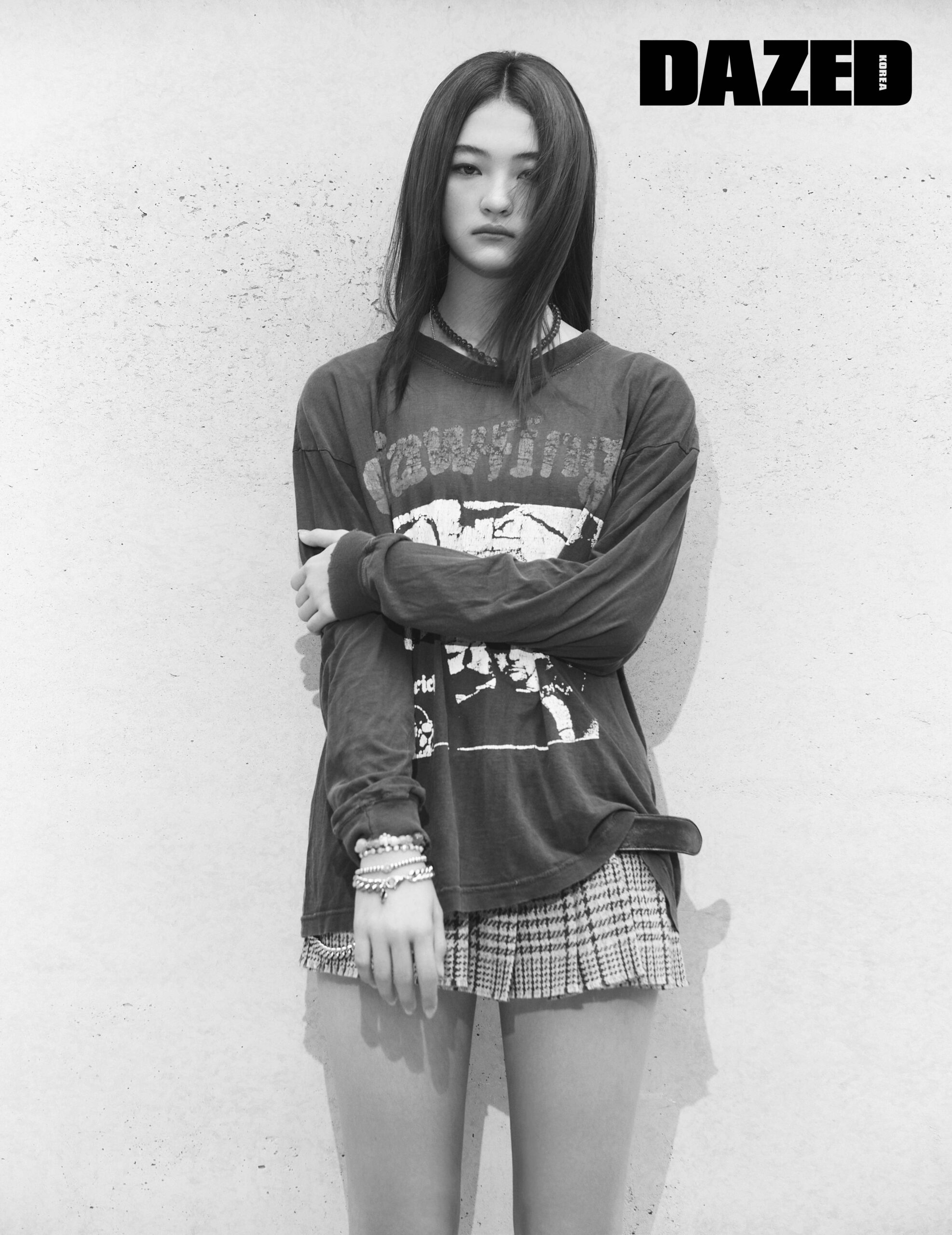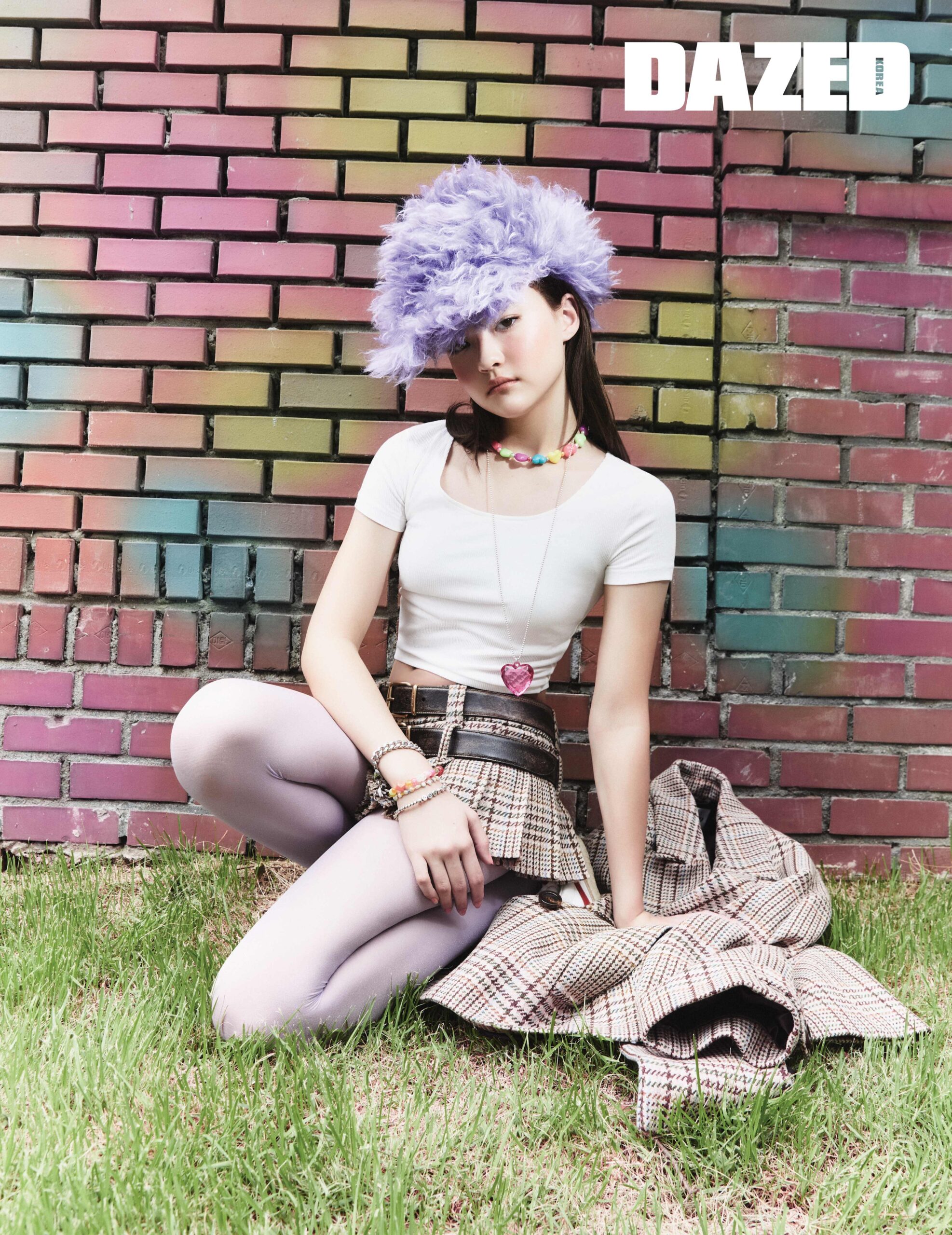 라운 글렌 체크 스커트와 벨트는 미우 미우(Miu Miu), 롱 슬리브 톱과 모든 브레이슬릿, 네크리스는 모두 스타일리스트의 것.