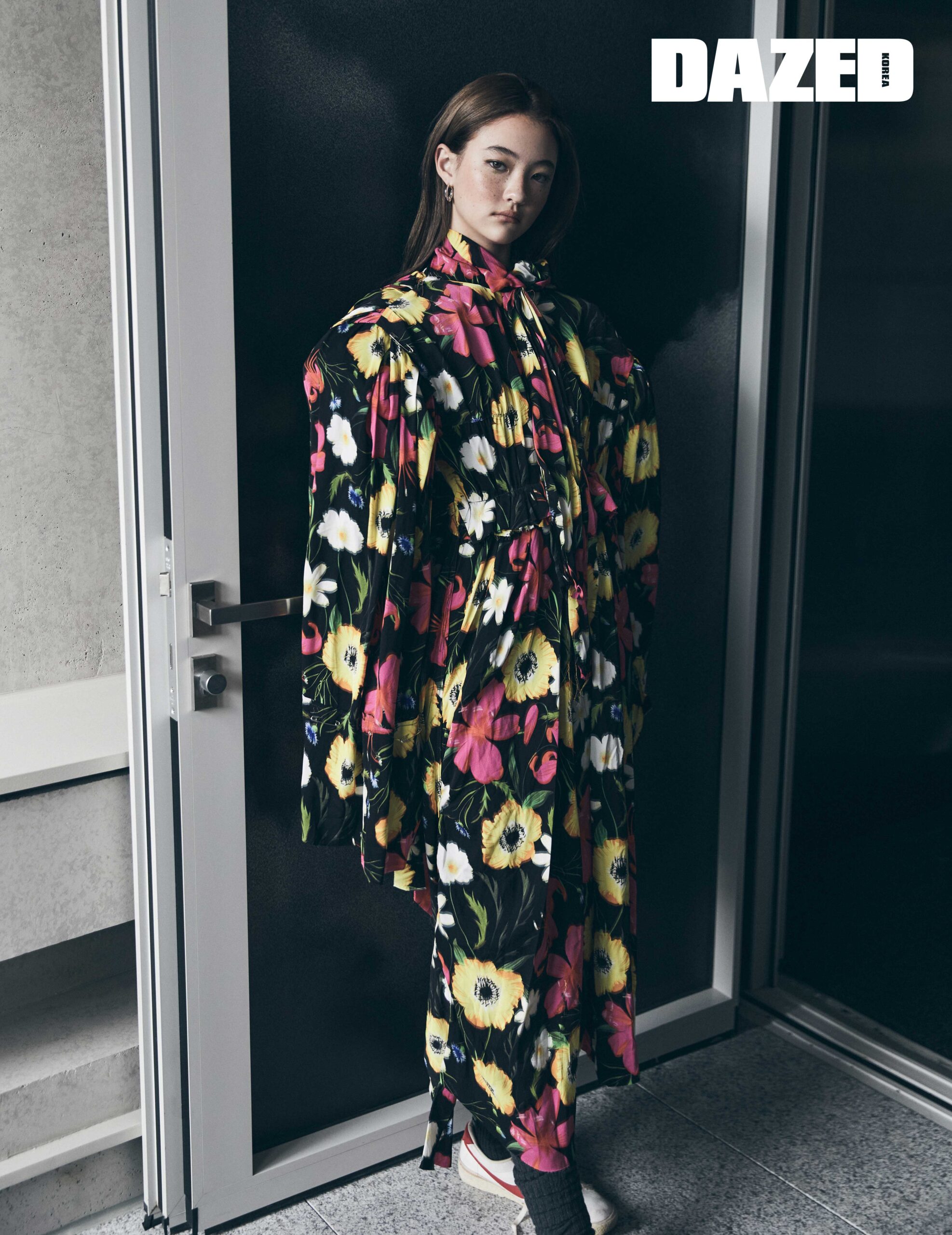 플라워 패턴의 핸드 스티치 드레스와 이어링은 발렌시아가(Balenciaga), 그레이 삭스는 미우 미우(Miu Miu), 빈티지 스니커즈는 스타일리스트의 것.