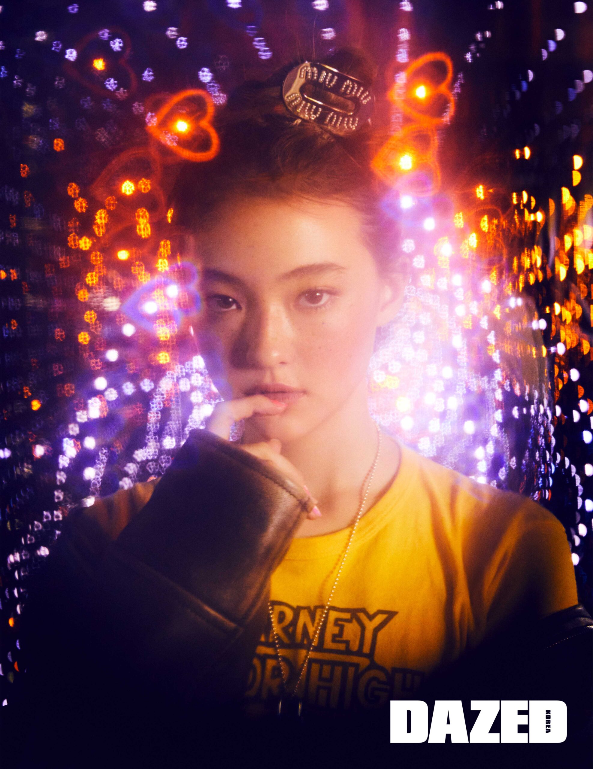 레더 재킷과 헤어 클립은 미우 미우(Miu Miu), 프린트 톱과 네크리스는 스타일리스트의 것.