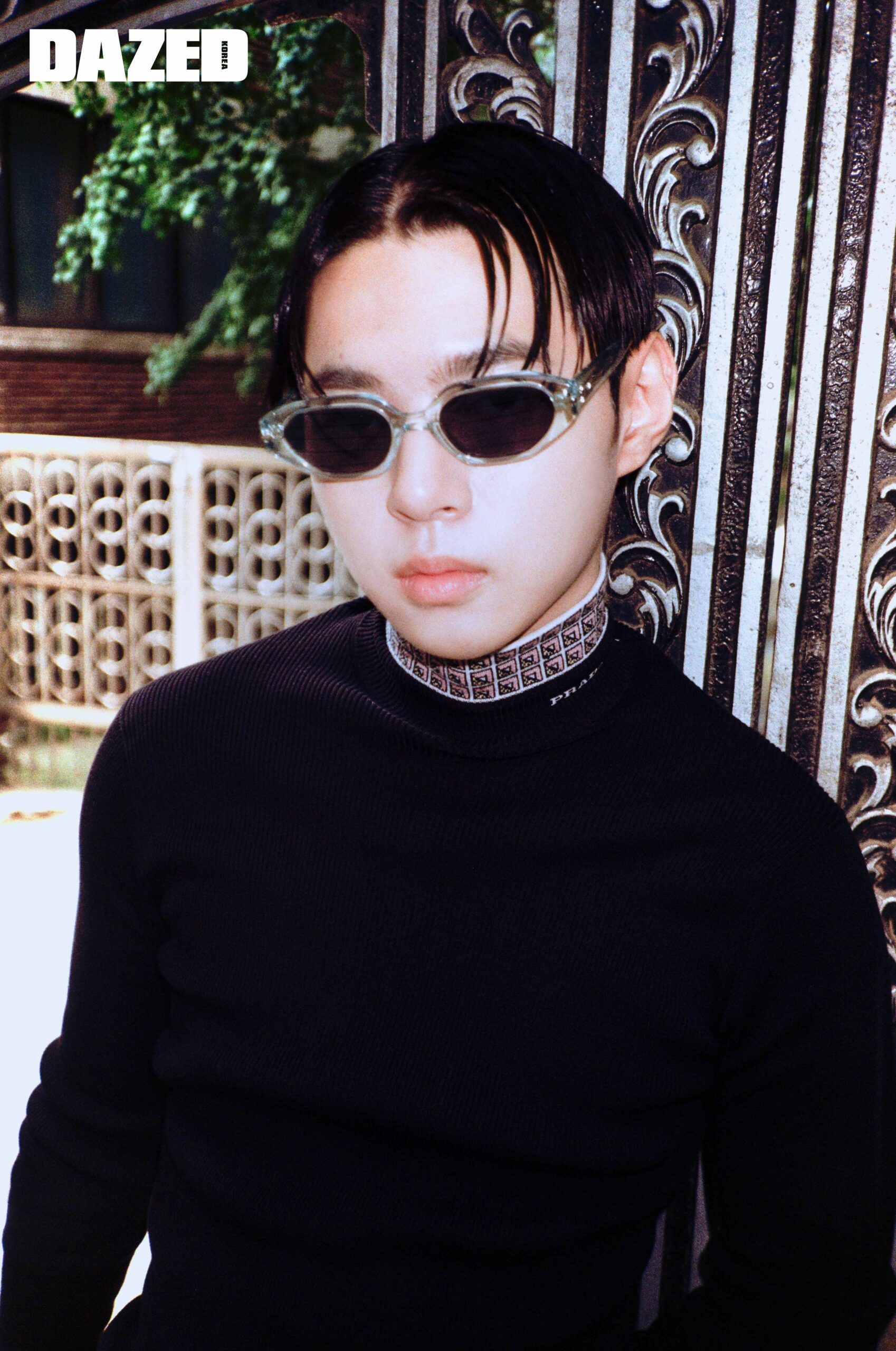 블랙 터틀넥 톱은 프라다(Prada), 선글라스는 젠틀 몬스터(Gentle Monster).