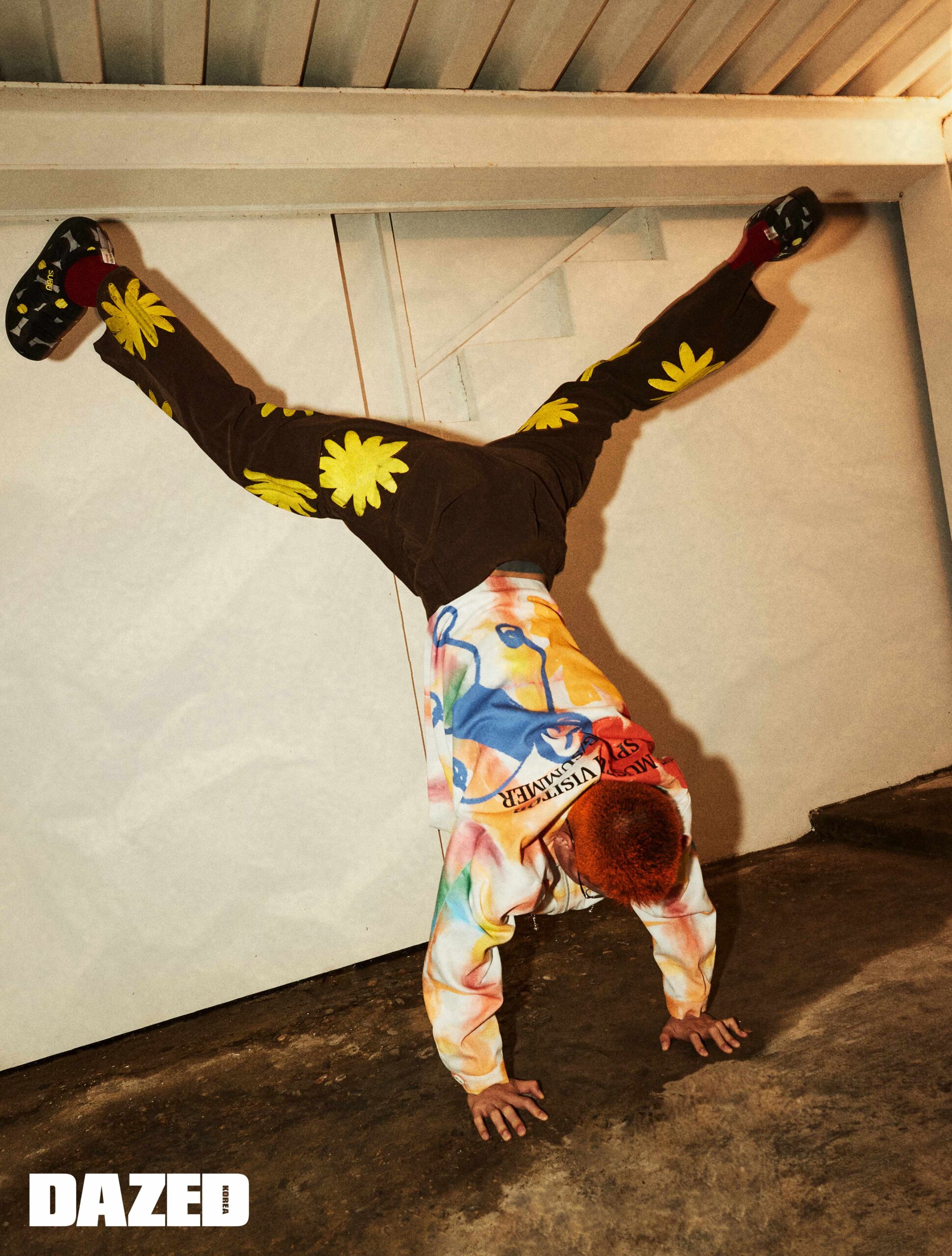 불도그 워크 재킷과 플라워 페인팅 팬츠, 패딩 뮬은 모두 더뮤지엄비지터(The Museum Visitor).