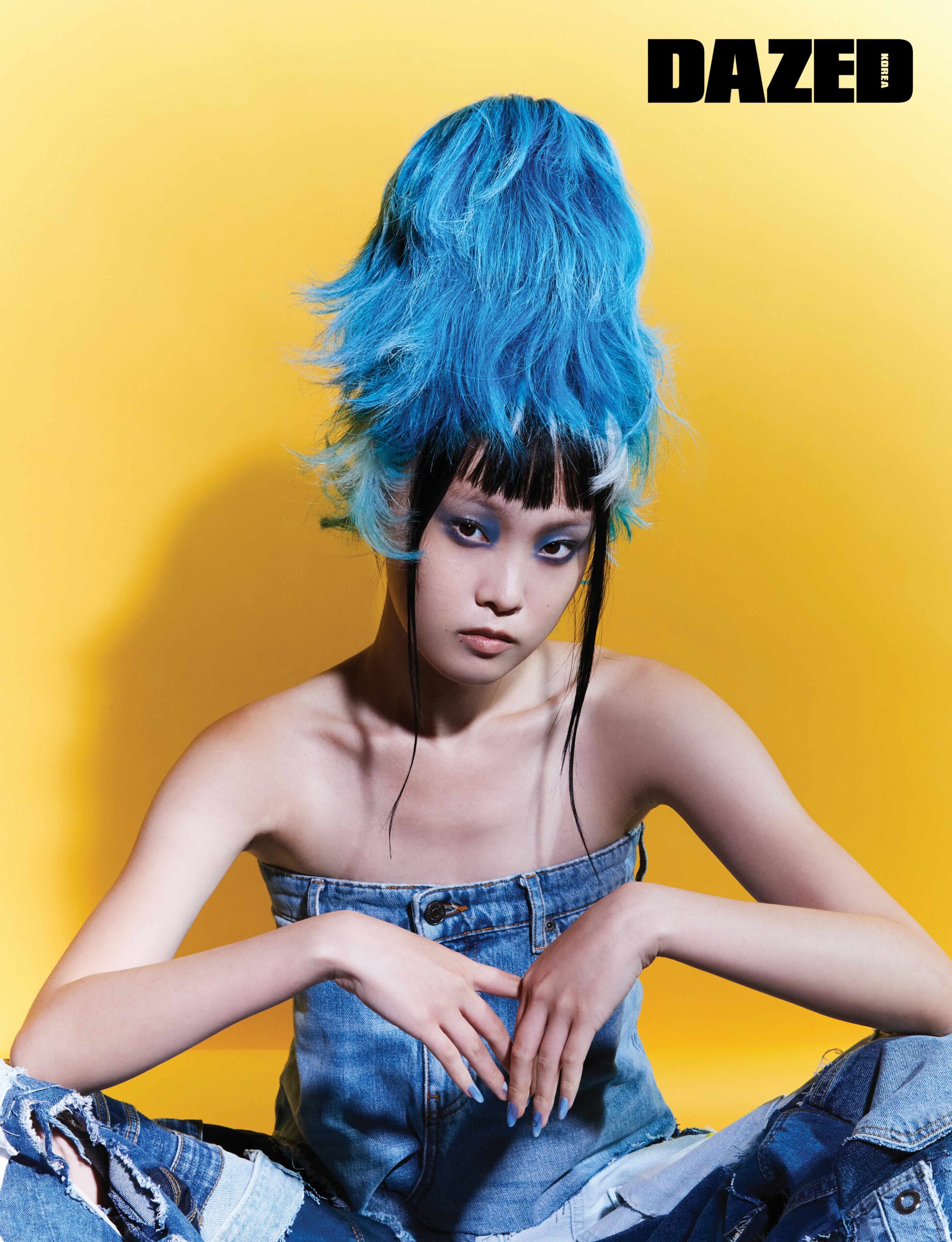 패치워크 데님 팬츠는 듀이듀이(Dew E Dew E), 블루 오벌 네일 팁은 핑거수트(Finger Suit), 데님 튜브톱은 에디터의 것.