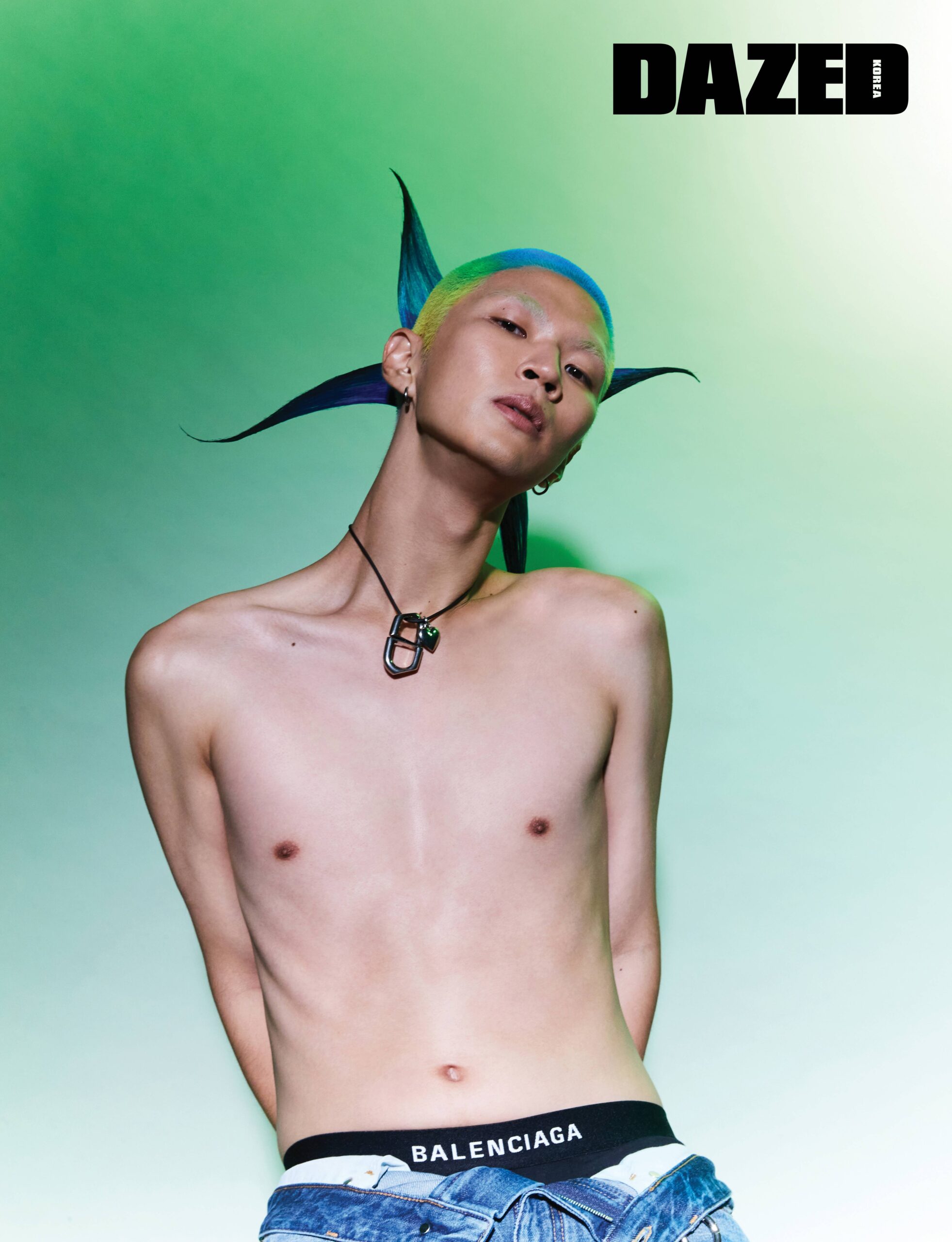데님 팬츠와 로고가 돋보이는 언더웨어, 네크리스 참으로 연출한 더블 링, 하트 참 네크리스는 모두 발렌시아가(Balenciaga).